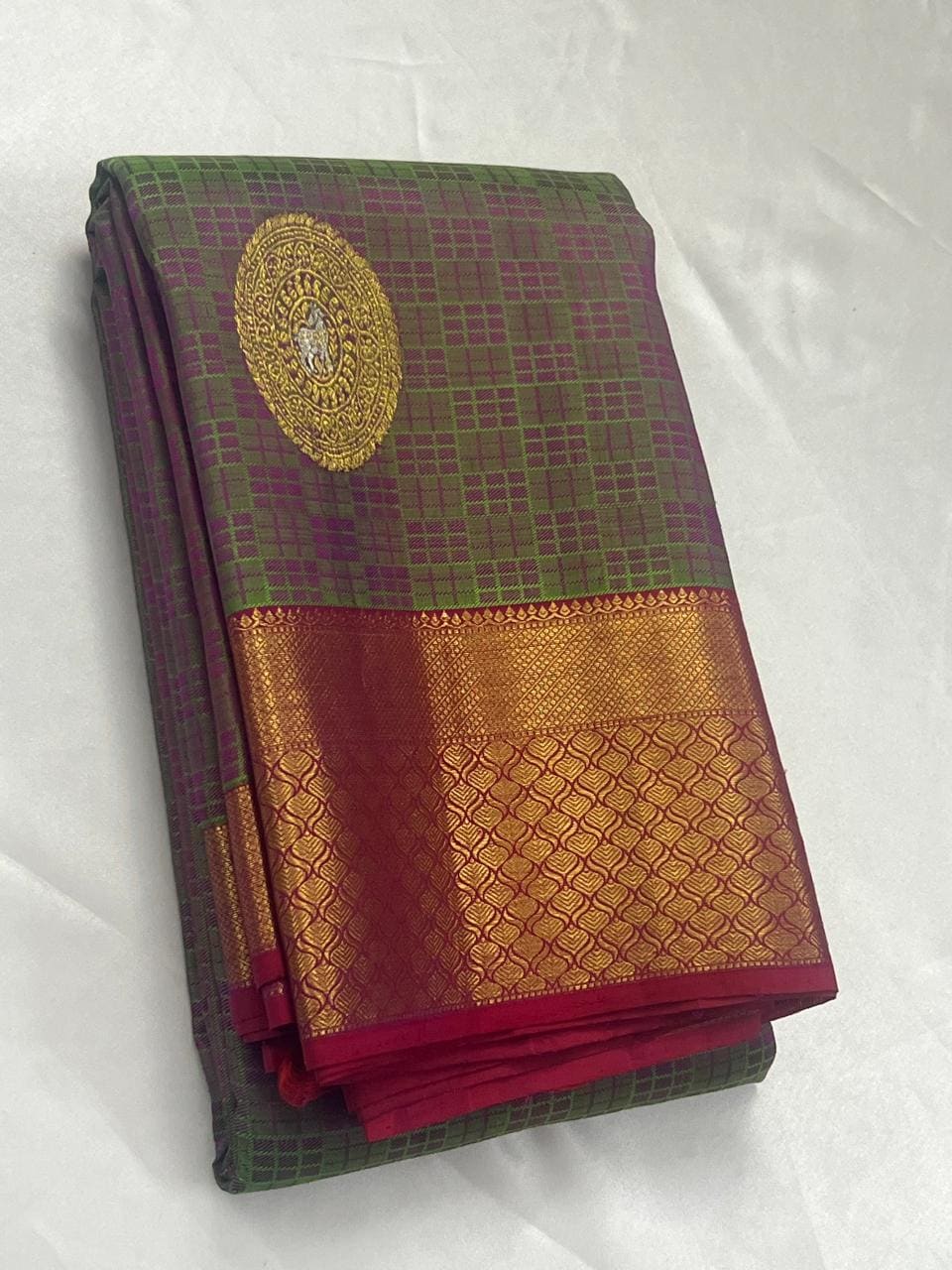 * Design: Dense, all-over antique gold zari floral brocade with a traditional heavy border and a subtle contrast edge