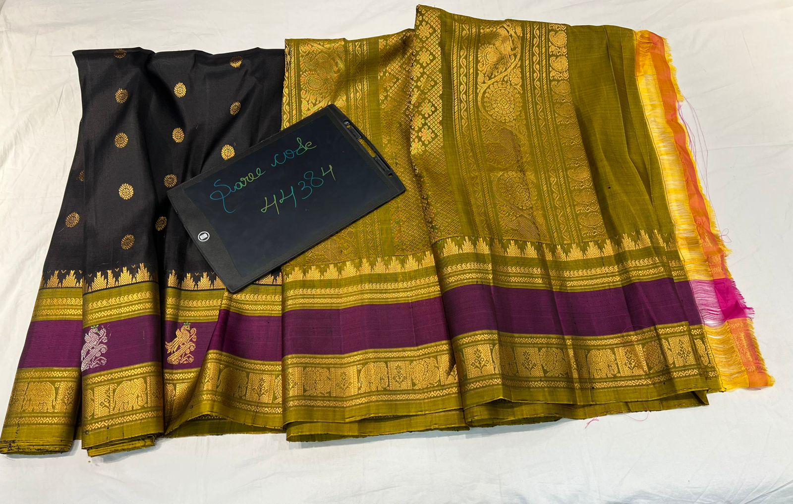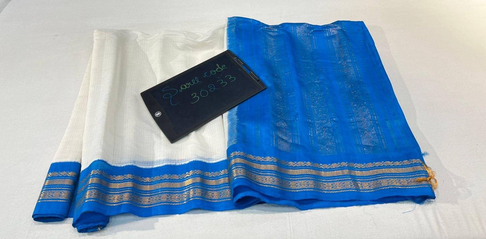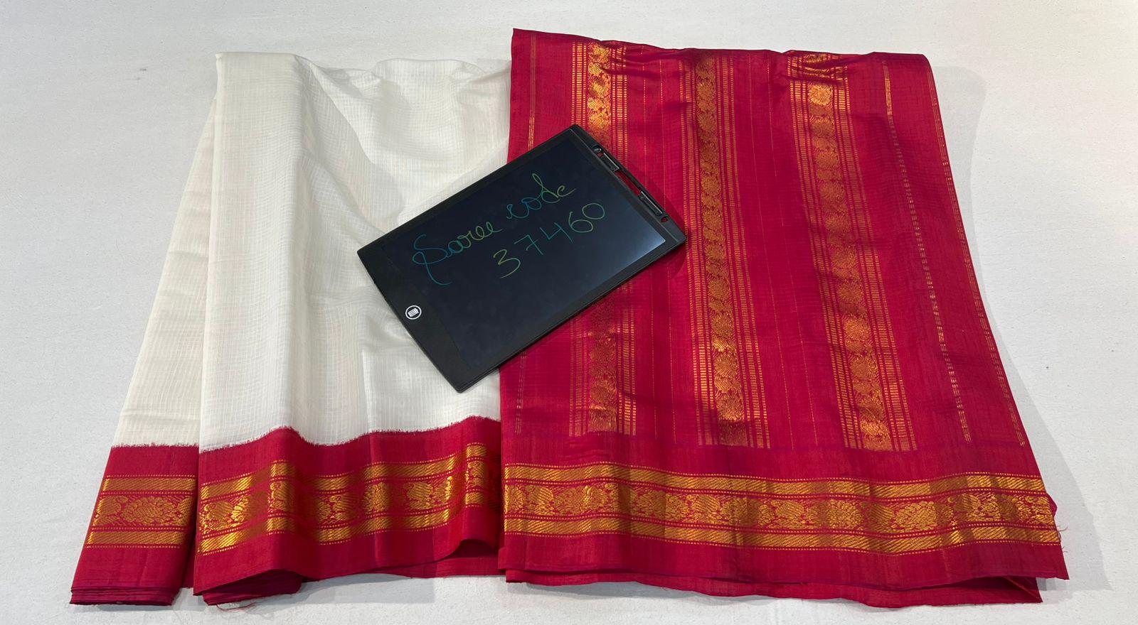 * Design: Silver-grey checkered (kattam) body with gold buttis, contrasting black temple border with traditional woven motifs