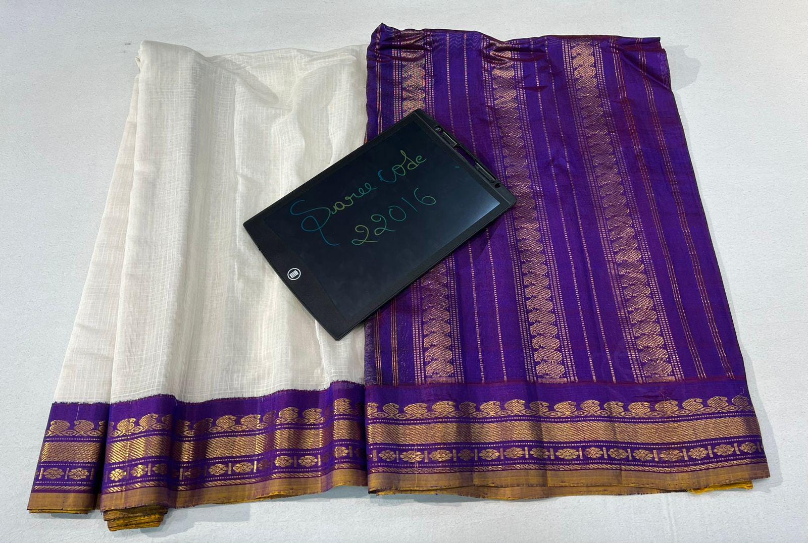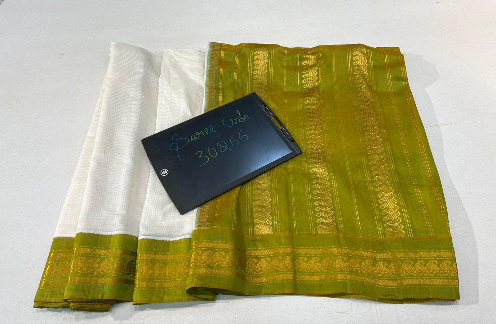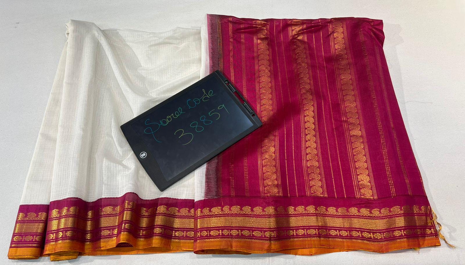 * Design: Silver-grey checkered (kattam) body with gold buttis, contrasting black temple border with traditional woven motifs