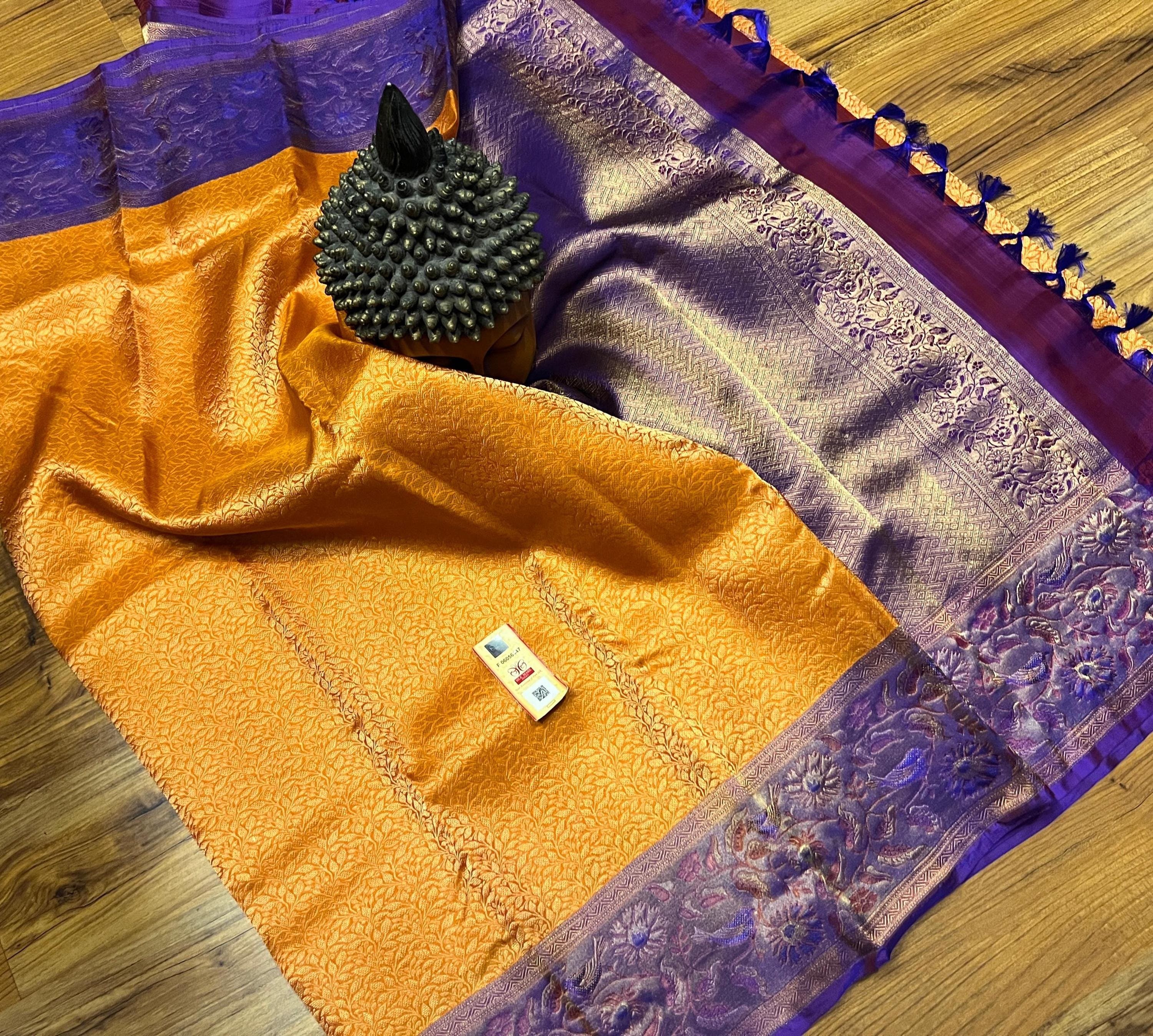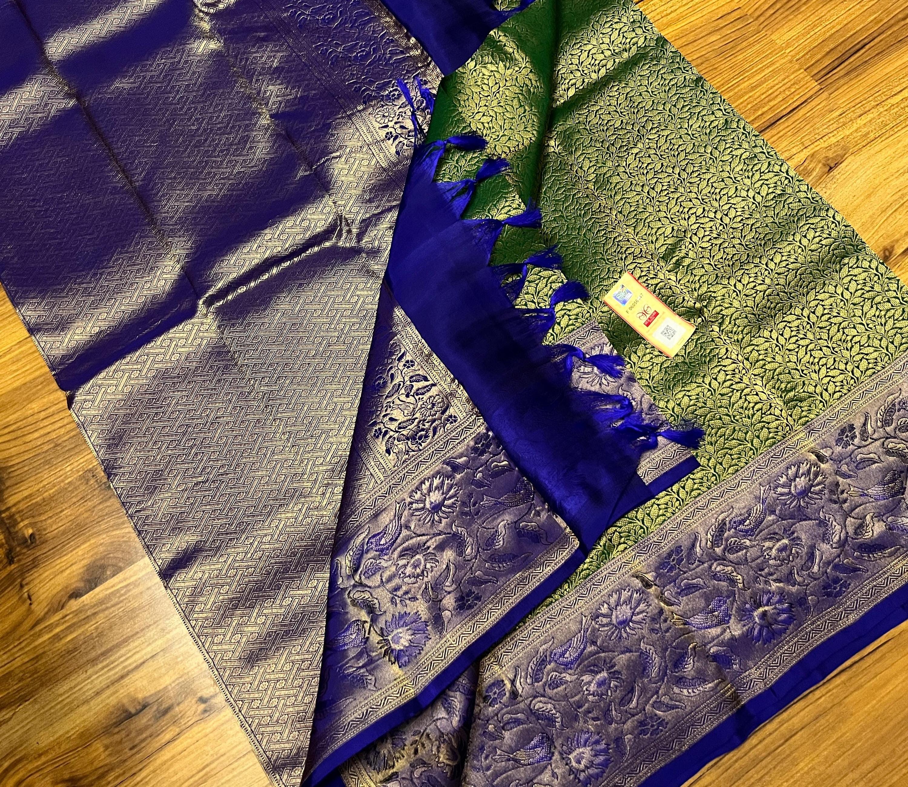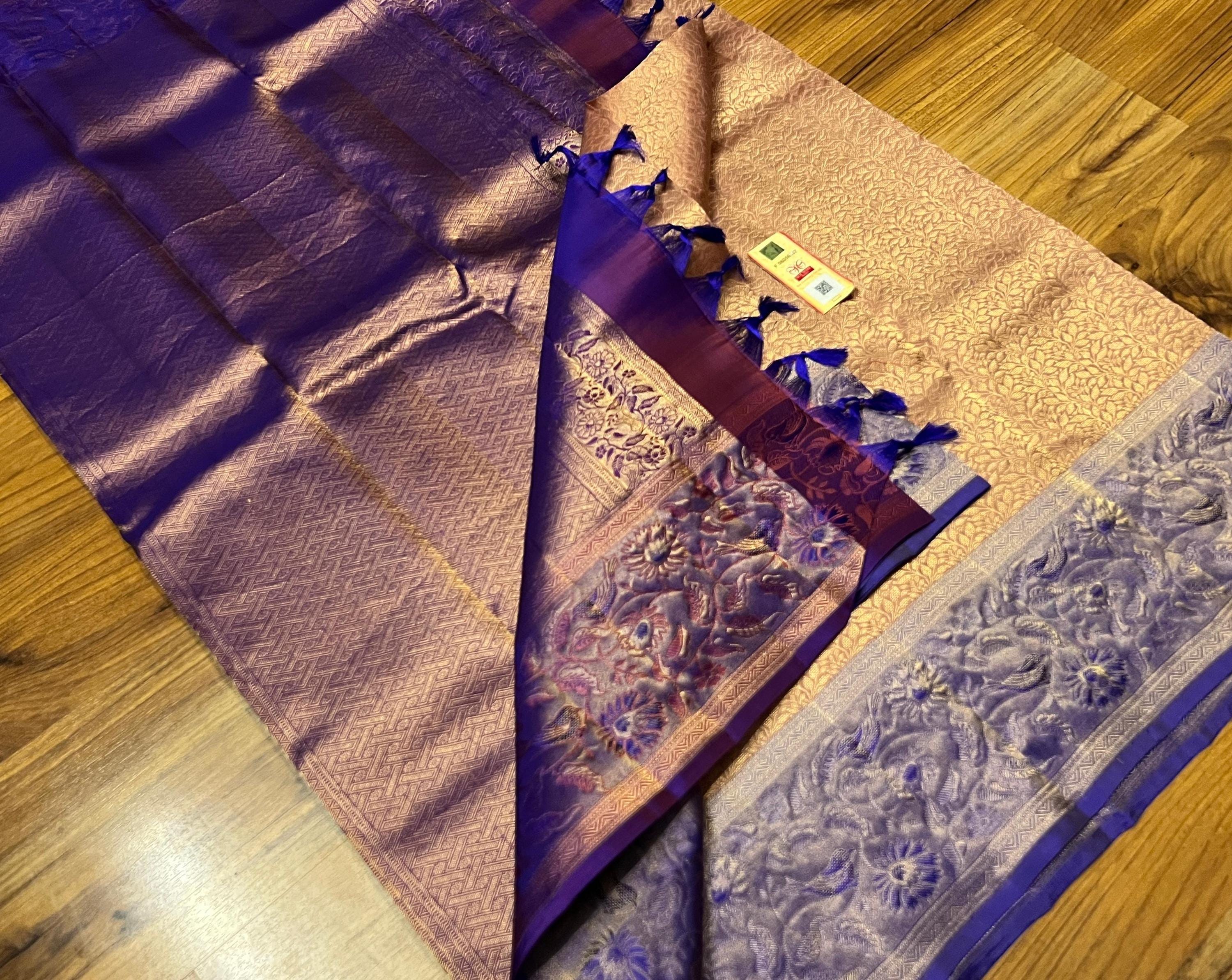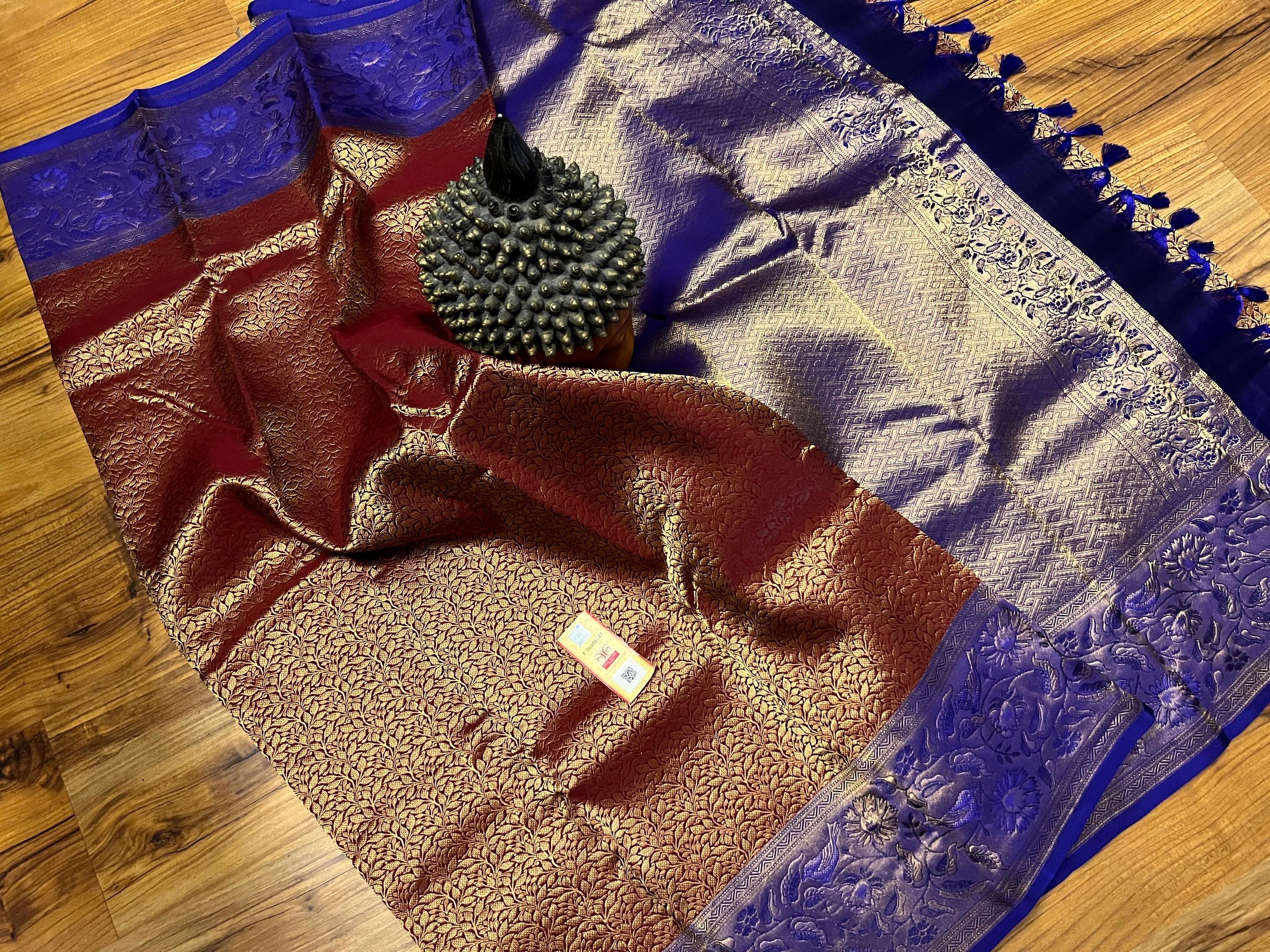 * Material: 100% Pure Kanjeevaram Silk woven with lightweight German Zari for a rich look and comfortable drape