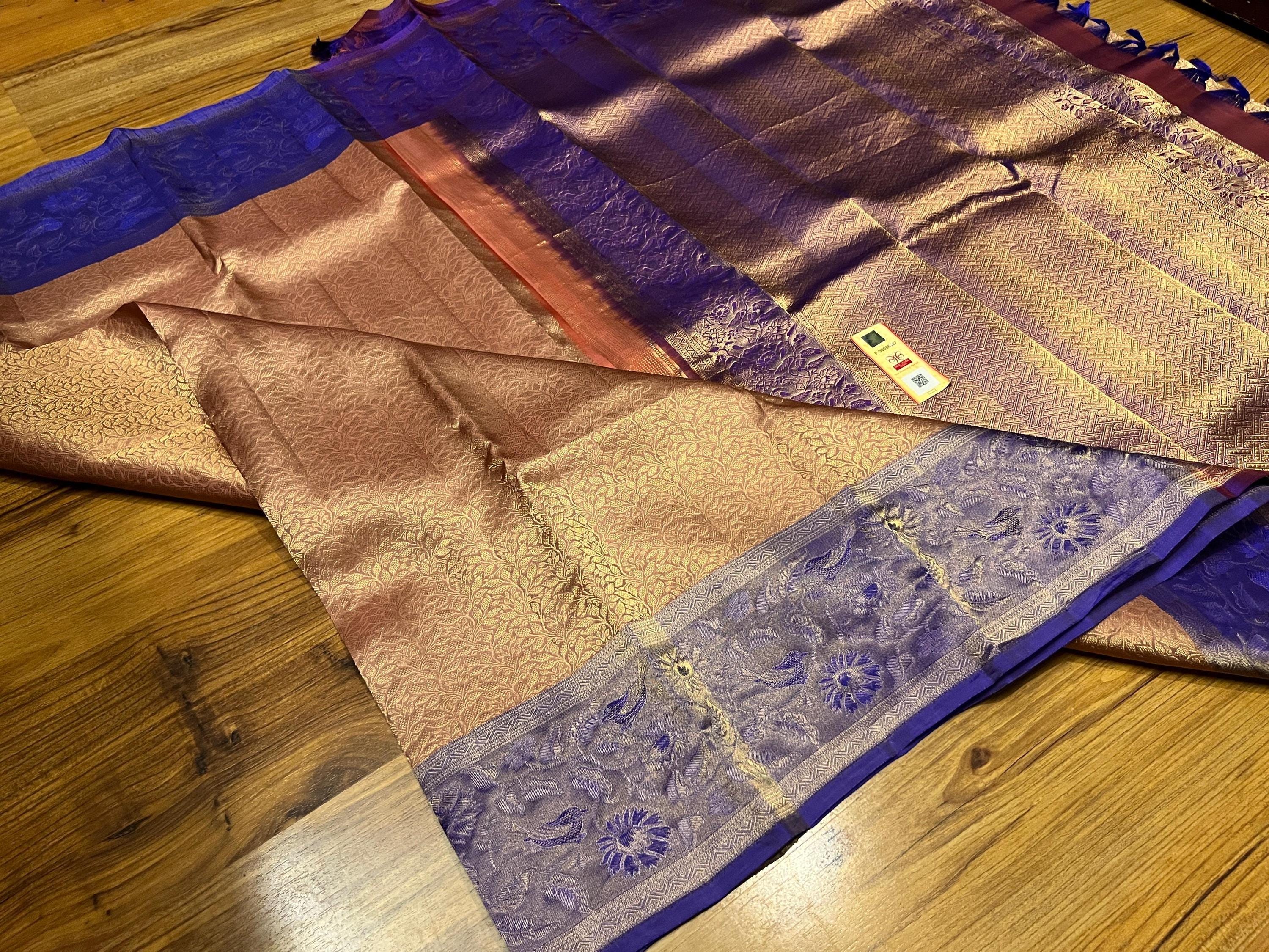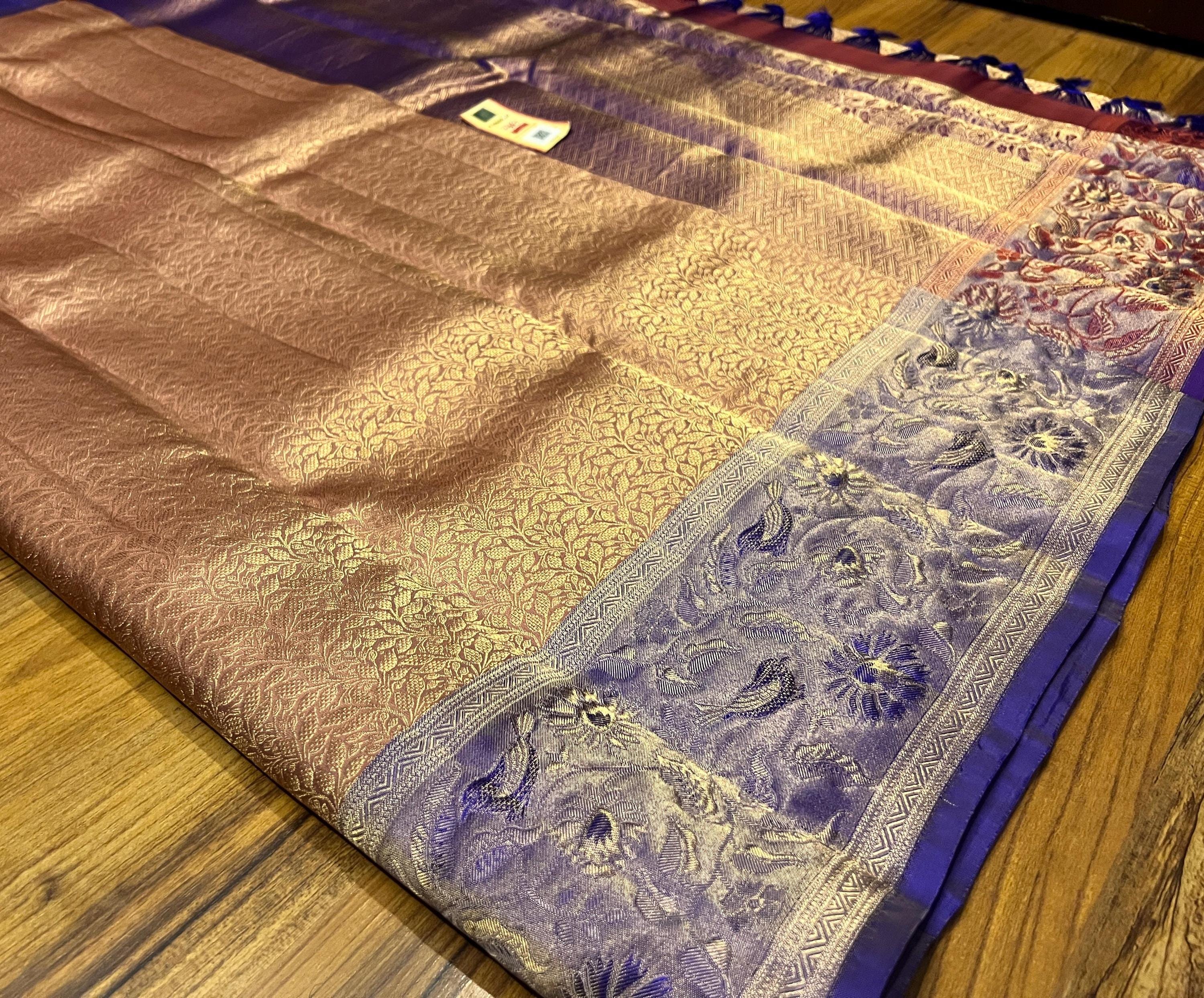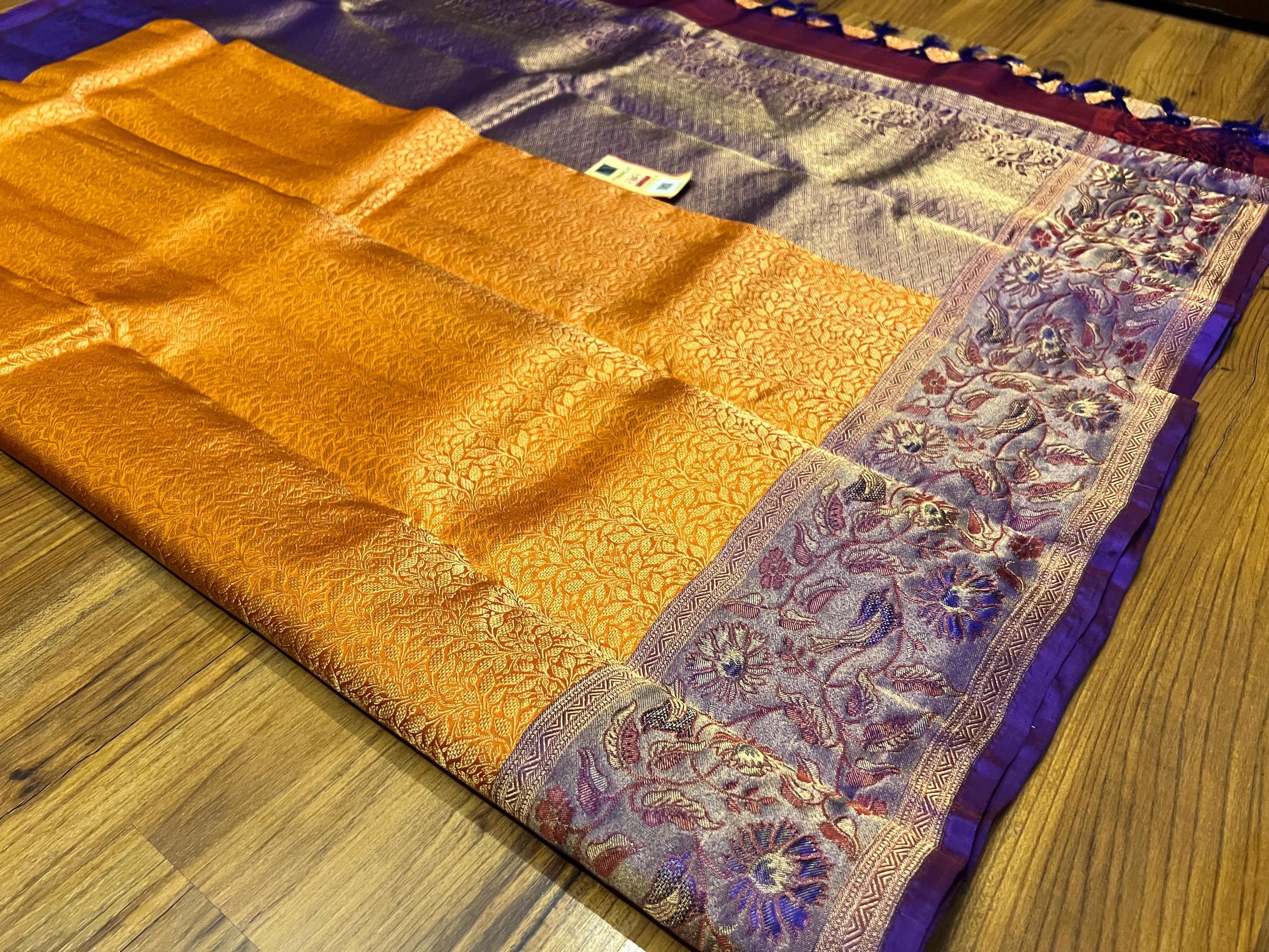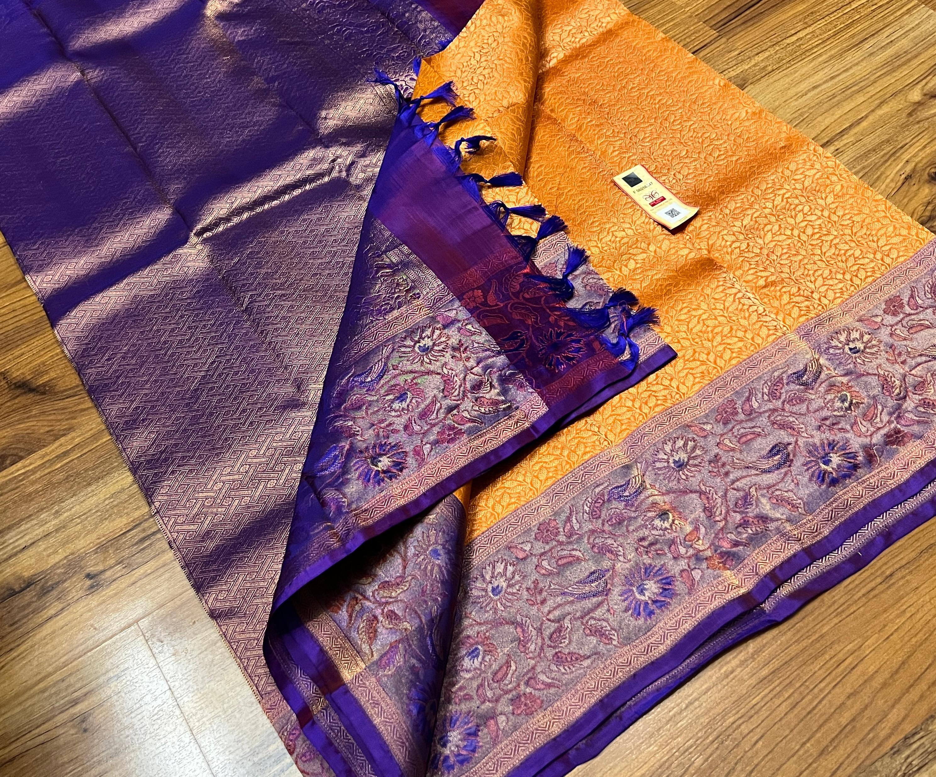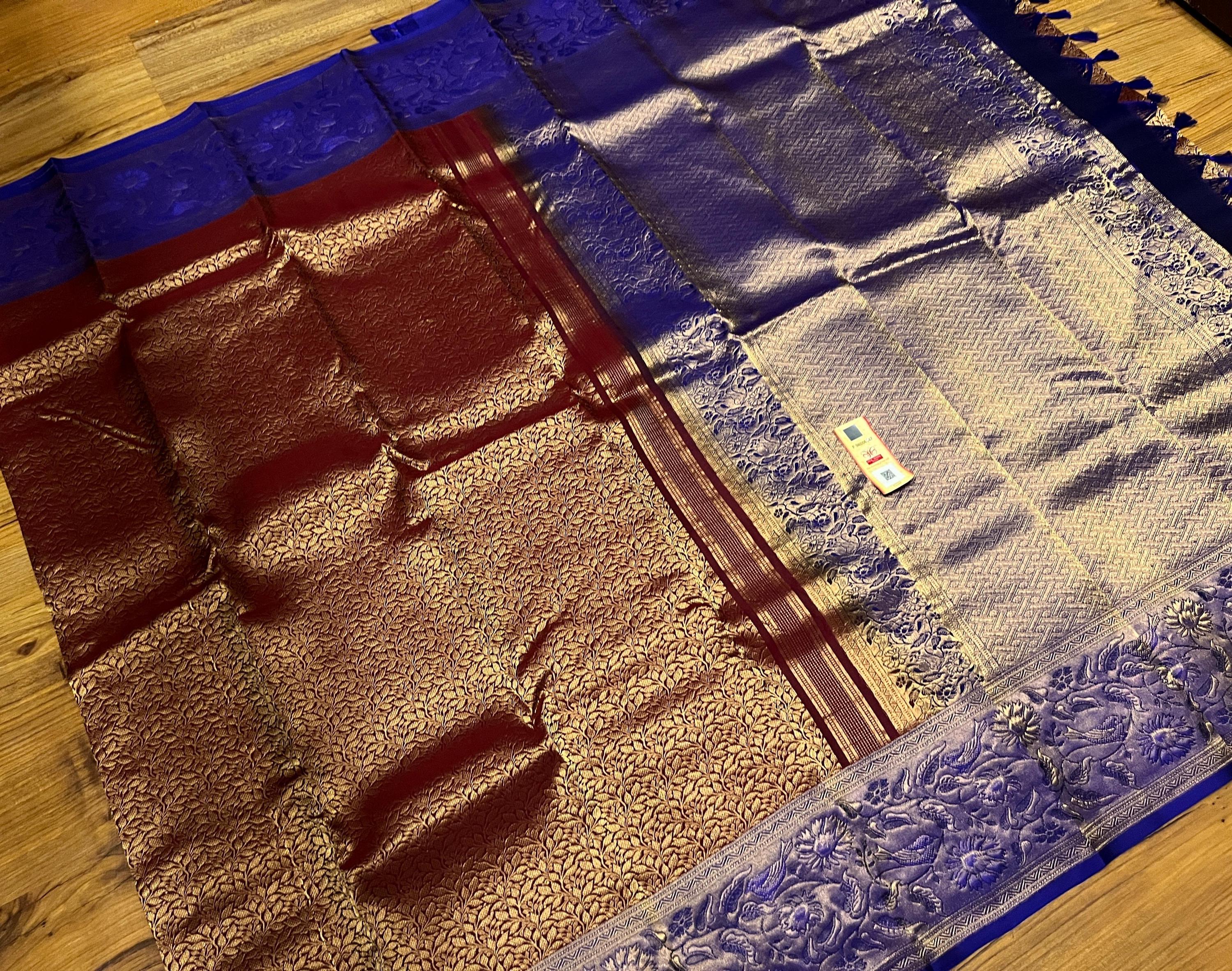 * Material: 100% Pure Kanjeevaram Silk woven with lightweight German Zari for a rich look and comfortable drape