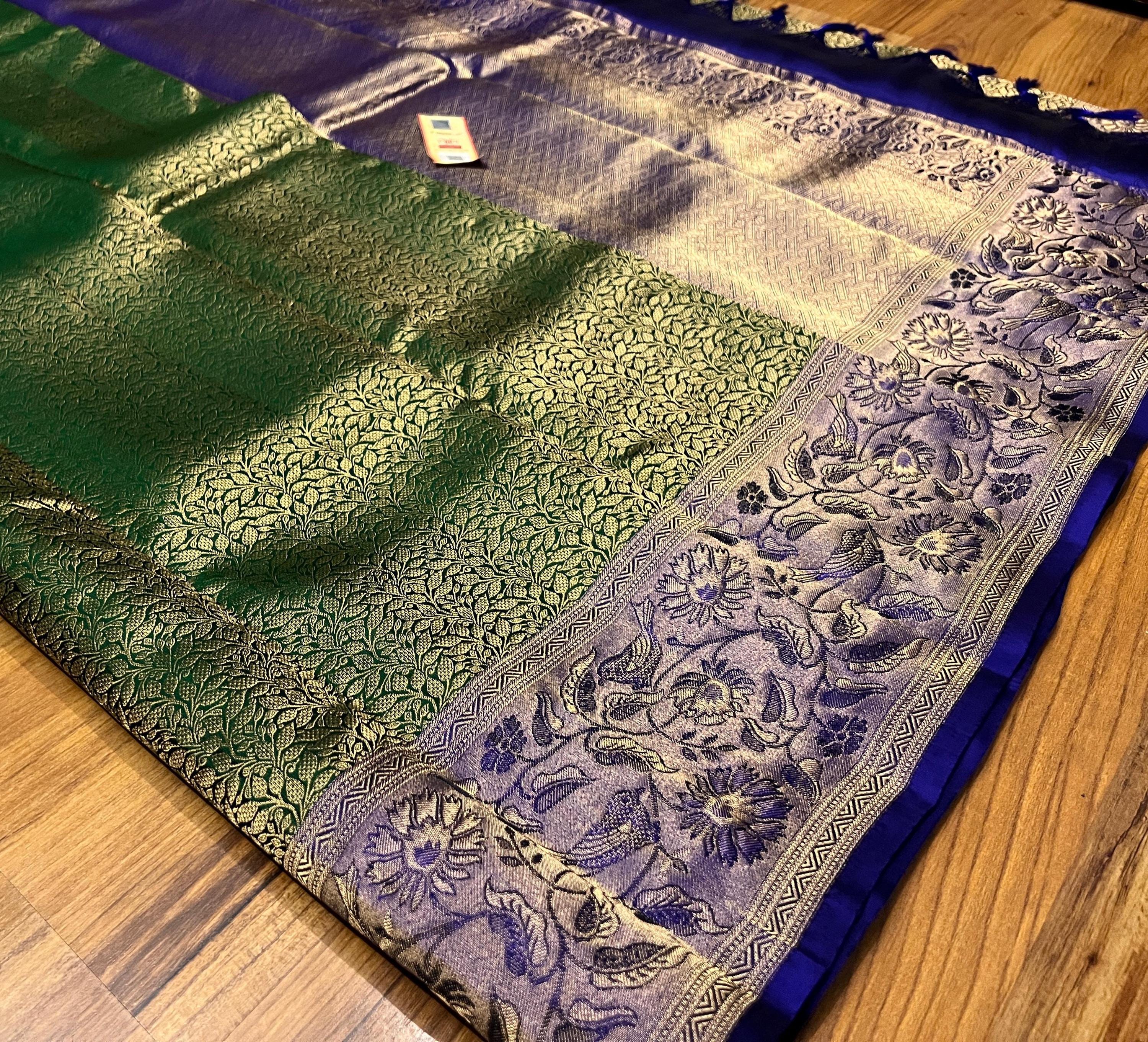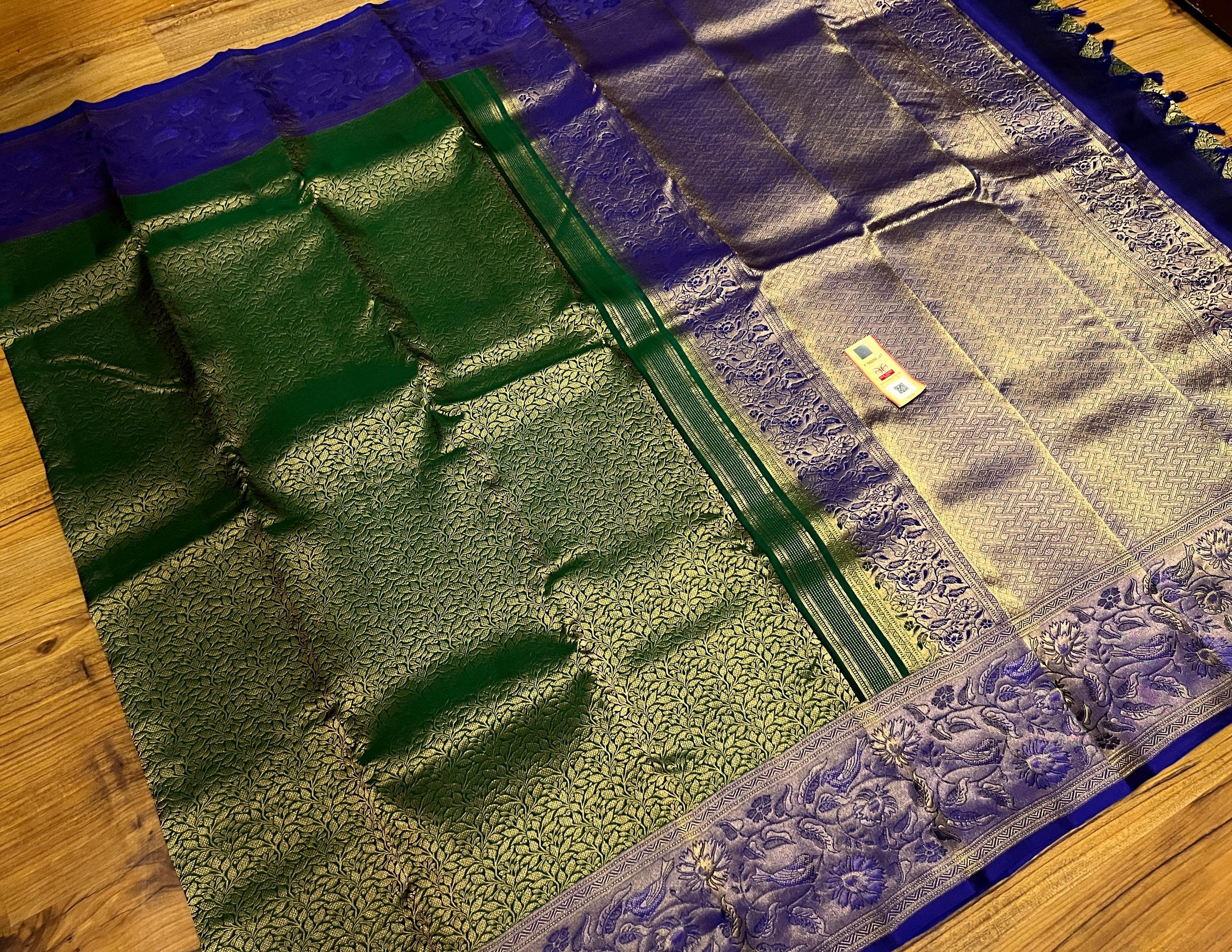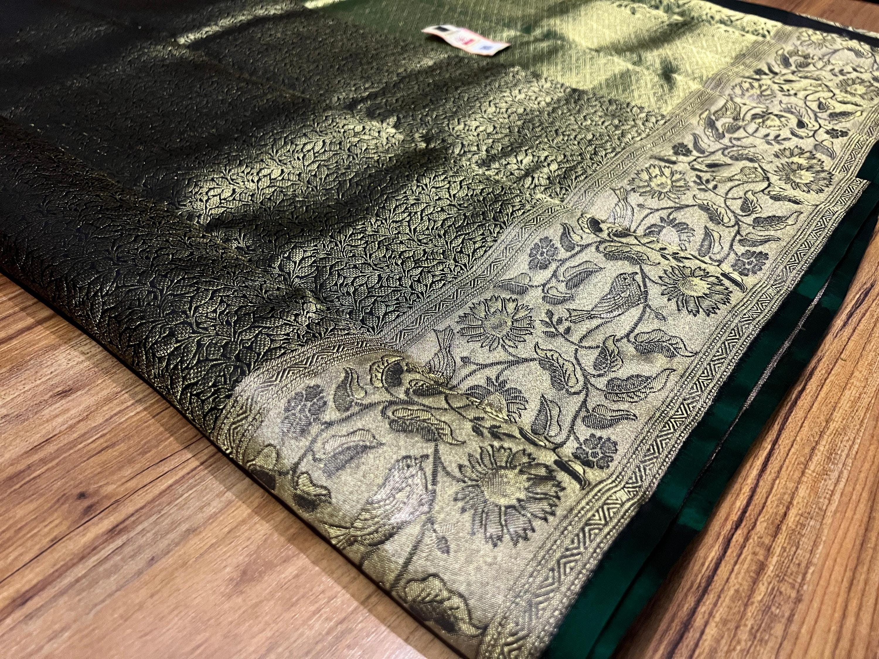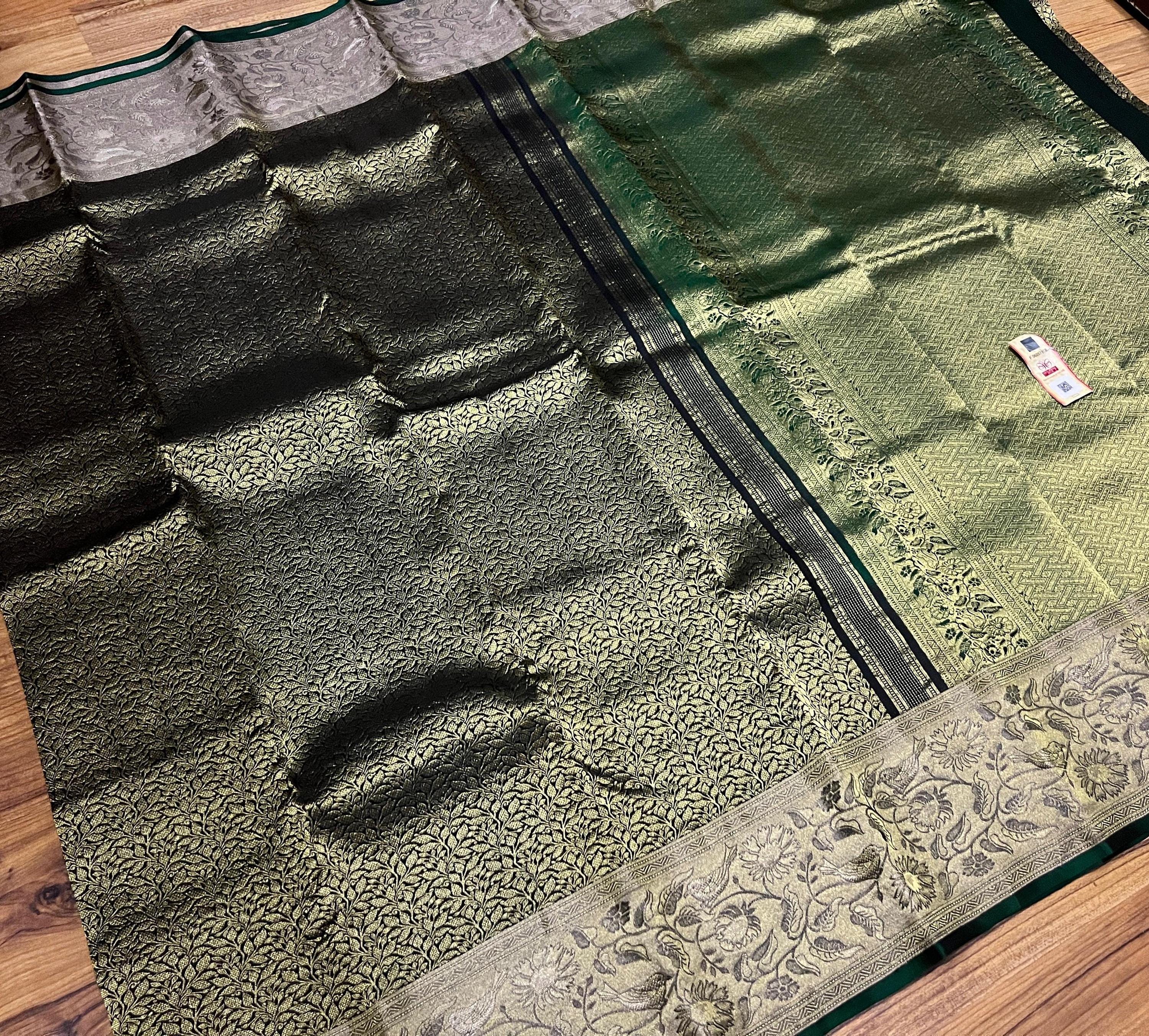 * Design: Deep emerald/bottle green base with heavy, all-over "turning work" brocade and an intricate floral vine border