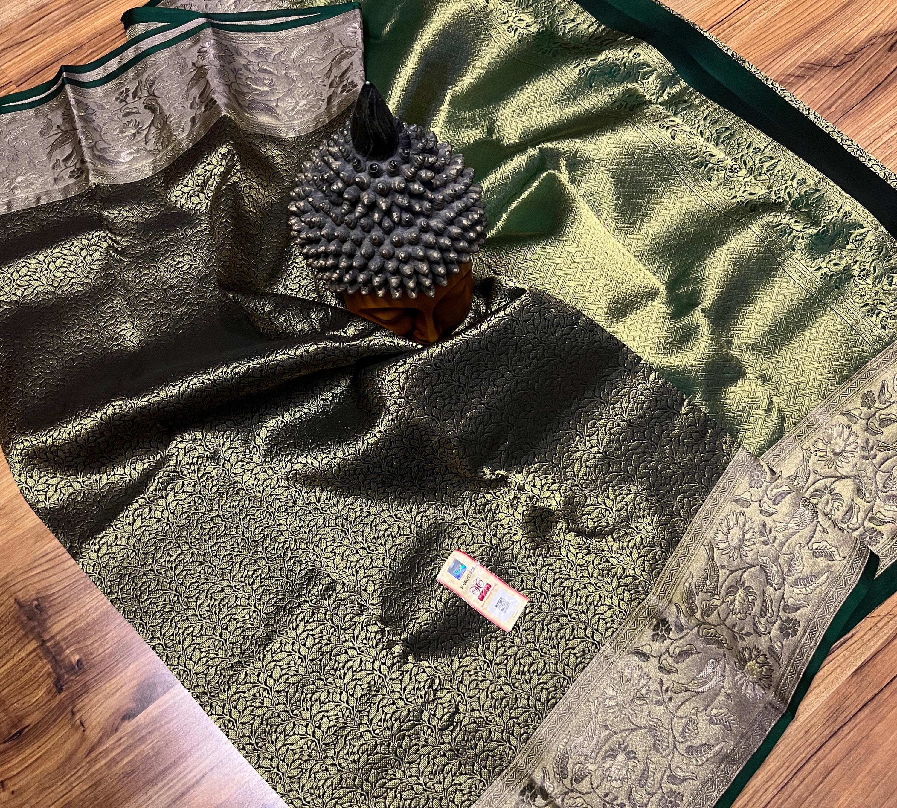 Designed for the woman who loves a heavy, regal look without the exhausting weight, this drape is a true weaving marvel. It features a deep, luxurious emerald green body that is completely enveloped in intricate, all-over "turning work" brocade. Woven with premium, lightweight German silver zari, the saree showcases spectacular floral and bird motifs along the dense, traditional border, offering a brilliant antique metallic sheen that commands attention in any room.
