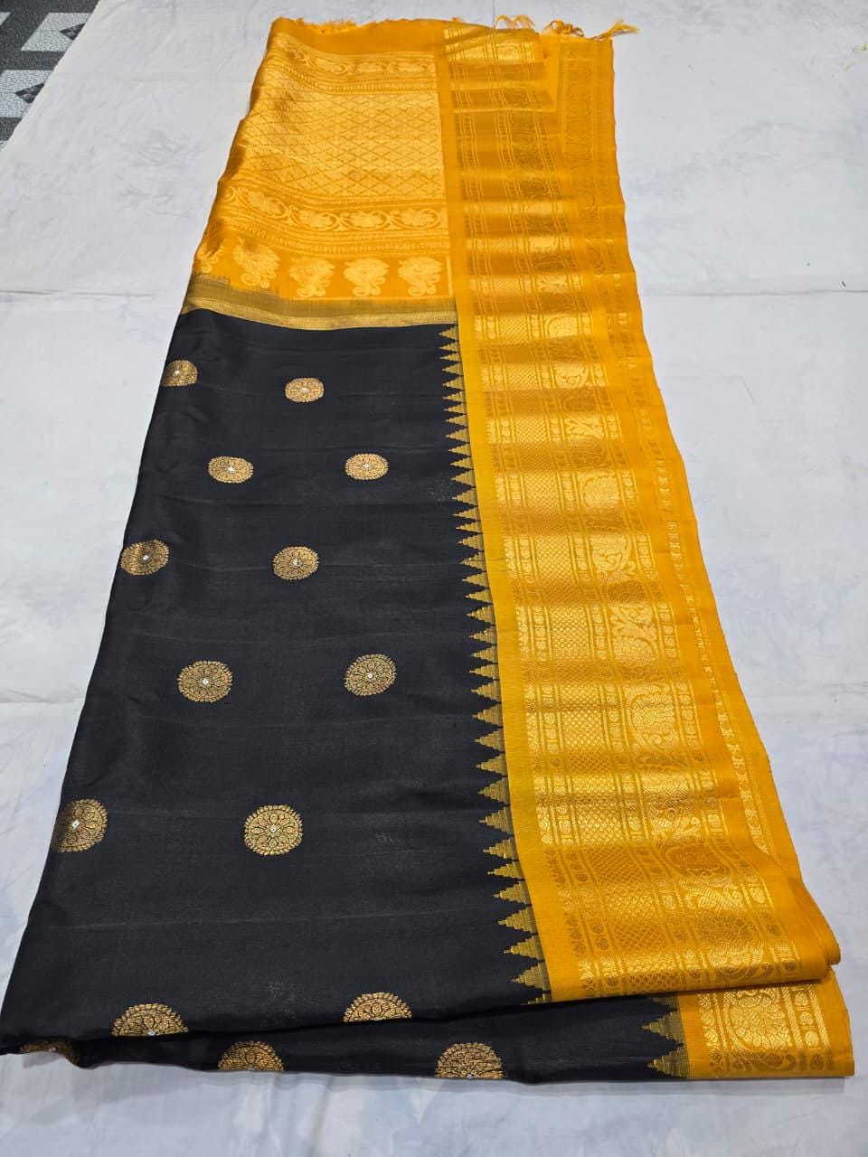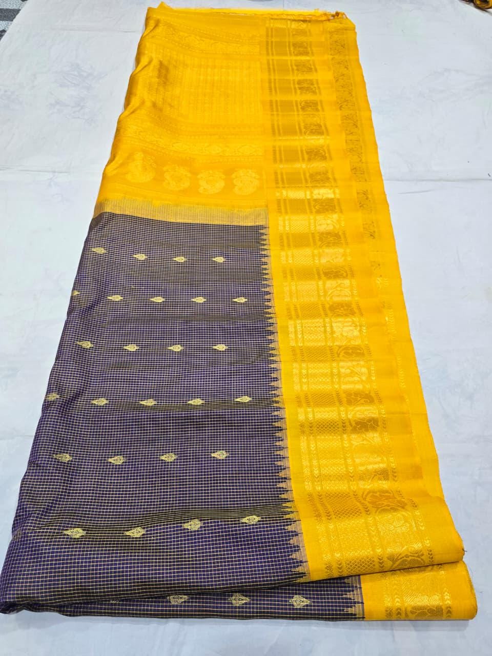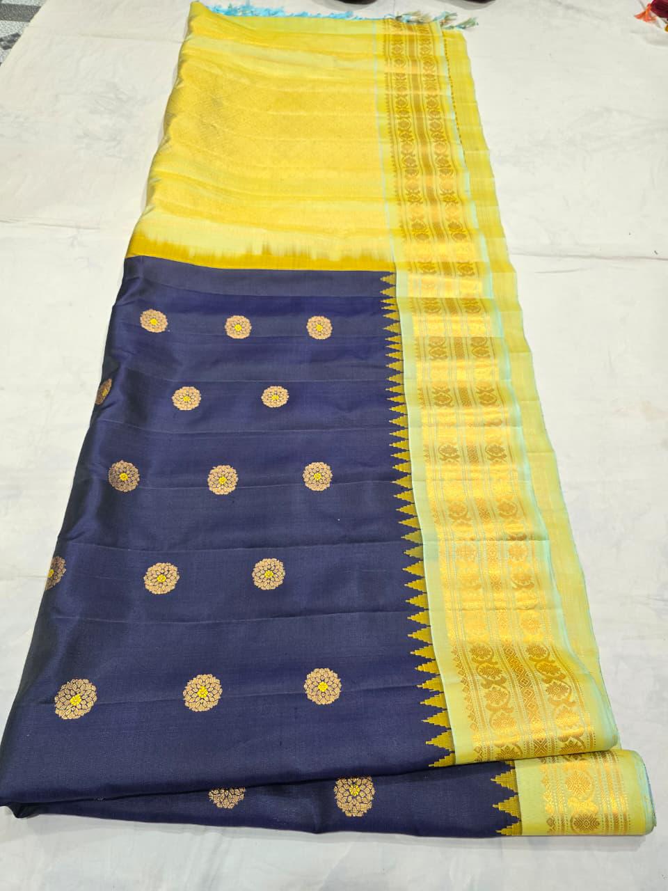 Renowned for its distinctive interlocking weave (Kuttu) and spectacular color contrasts, this exquisite drape is a true collector's piece. It features a deep, elegant charcoal-grey body delicately adorned with woven gold zari buttas. The true showstopper is the massive, bright sunshine yellow contrast border and pallu, seamlessly joined to the body with traditional interlocking temple motifs. Woven using a premium "double warp" technique, this saree offers a richer, more durable feel while maintaining the beautifully crisp, fluid drape Gadwal silks are famous for.
