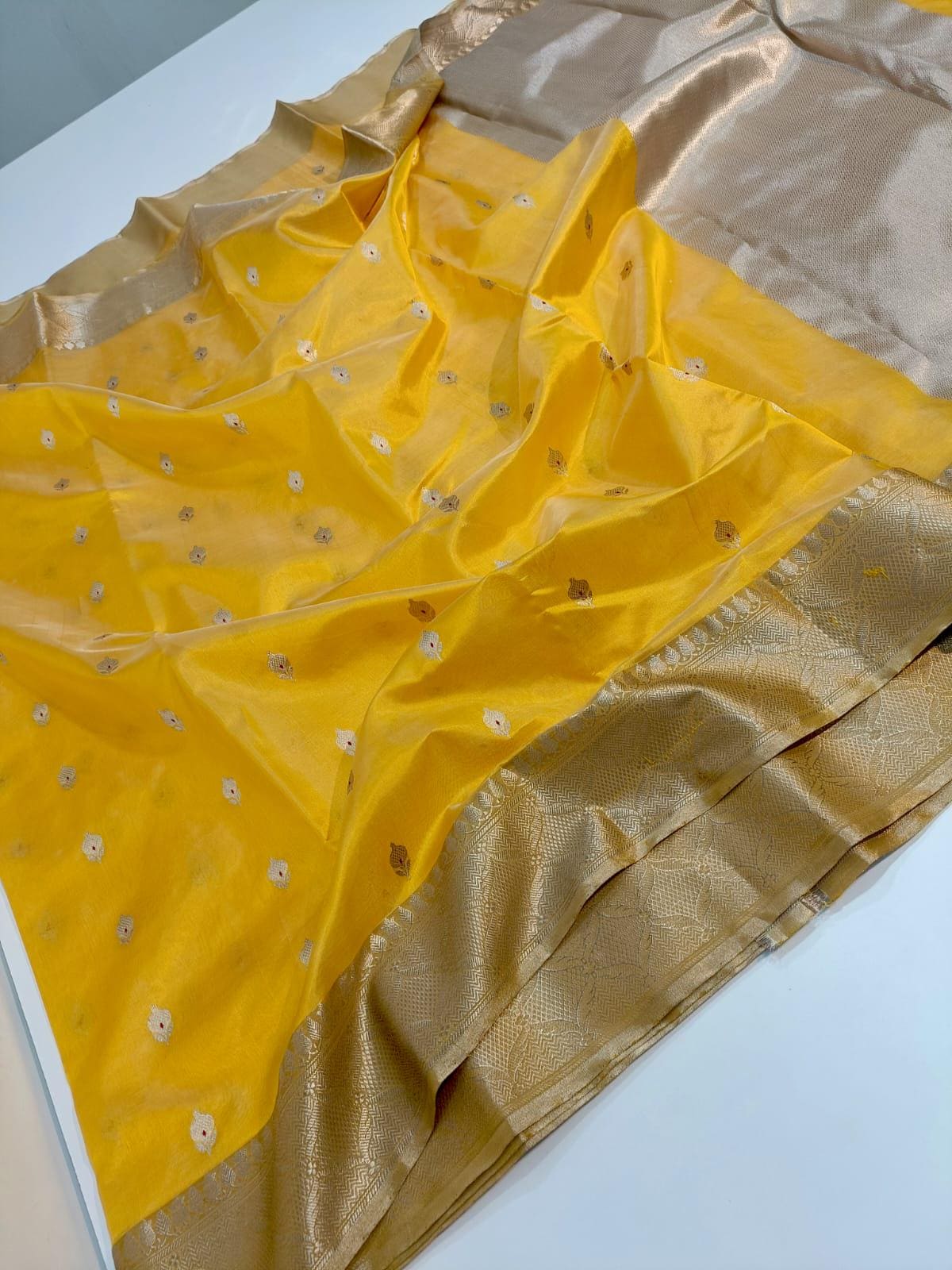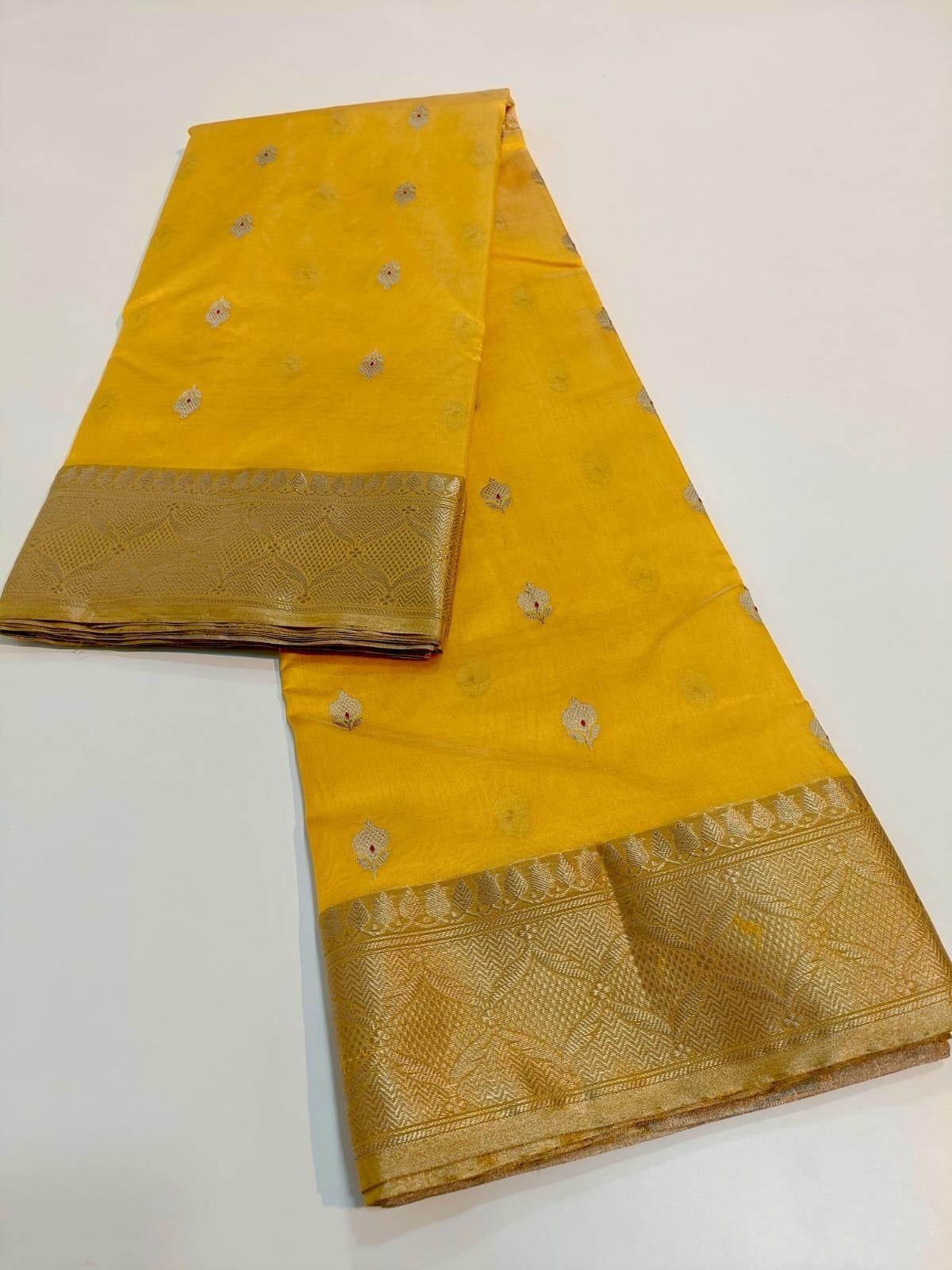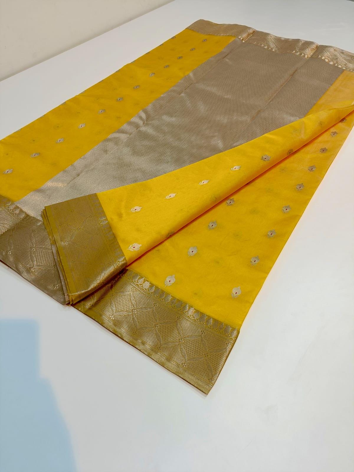 * Design: Bright yellow body par all-over butti ane heavy Nakshi zari border. Sathe matching blouse piece pan aavse.