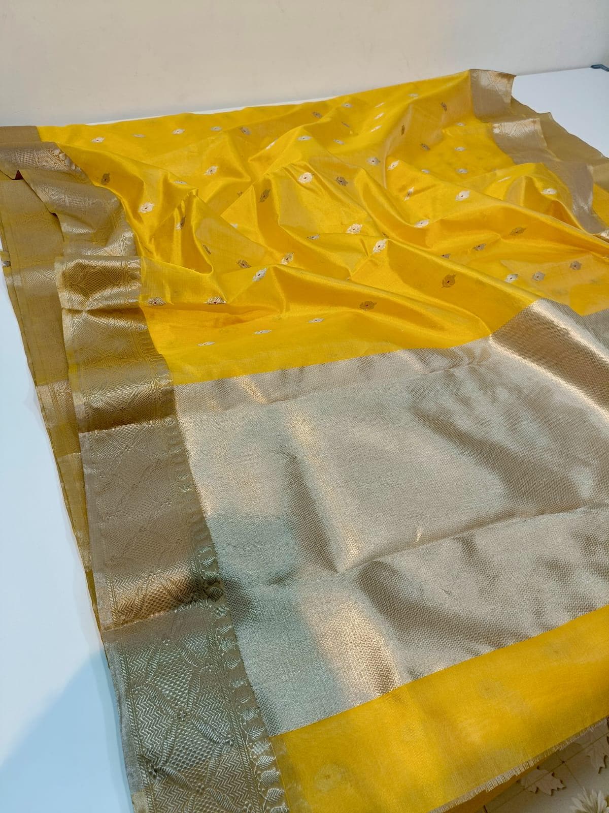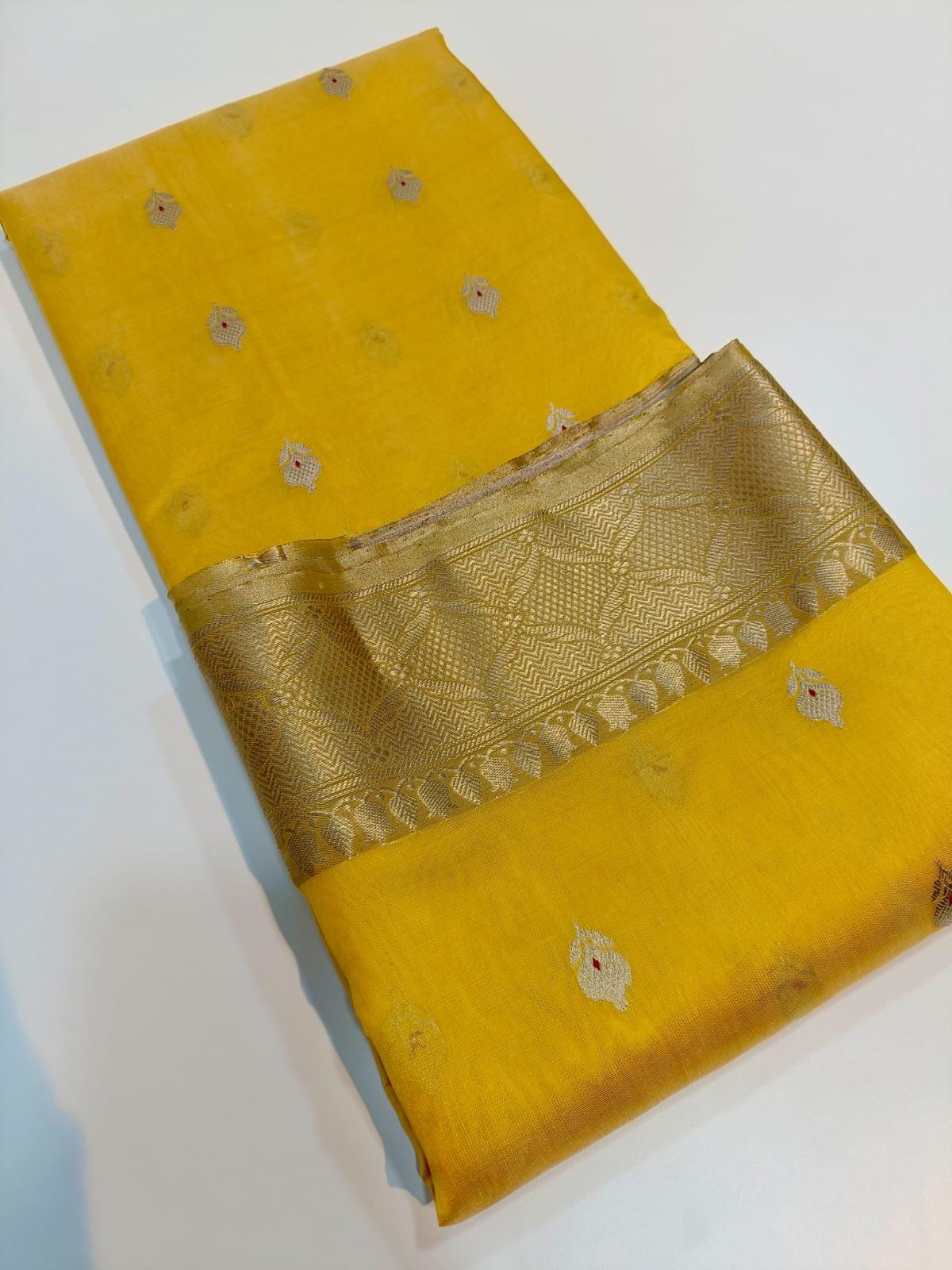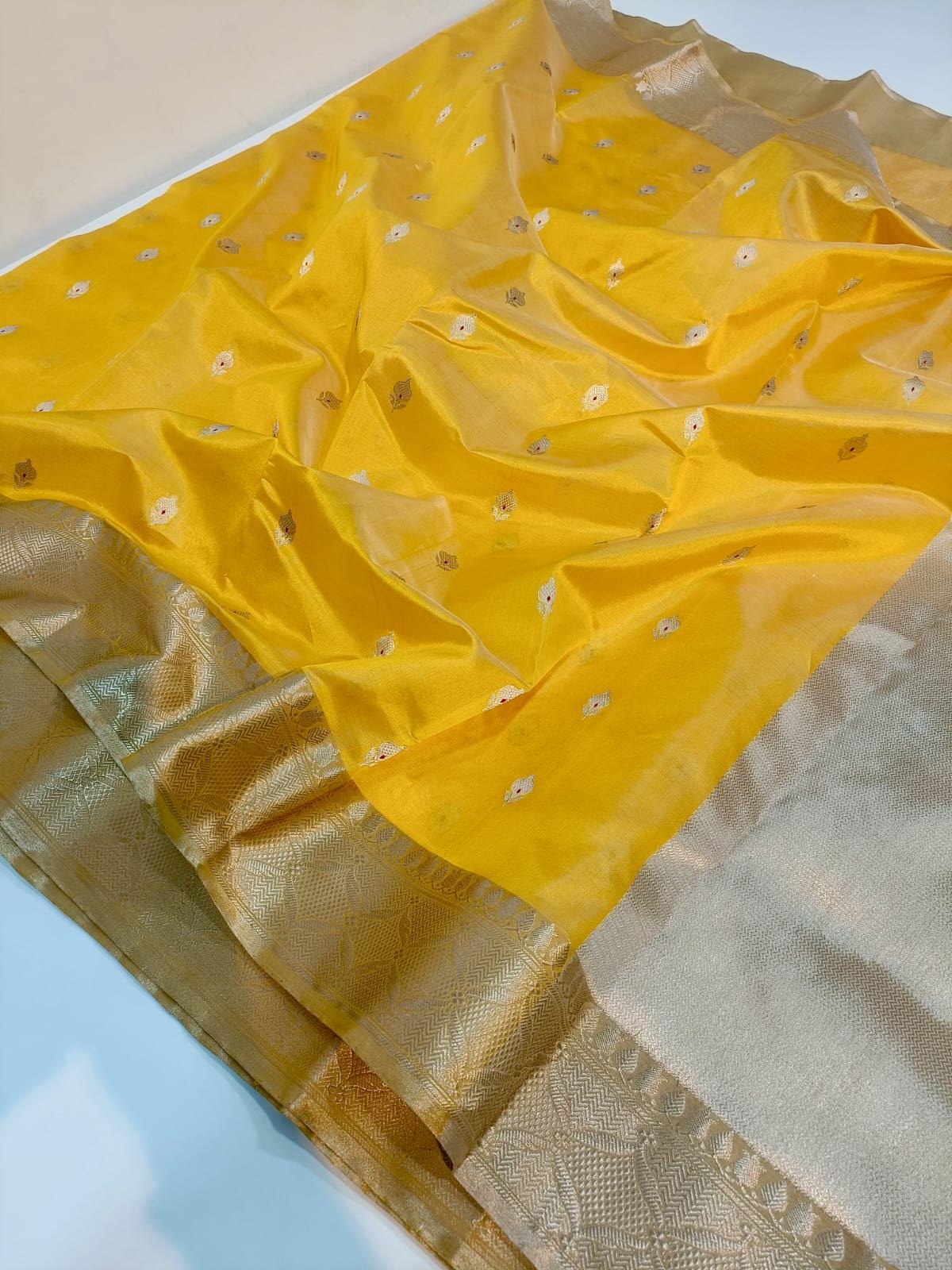 * Design: Bright yellow body par all-over butti ane heavy Nakshi zari border. Sathe matching blouse piece pan aavse.