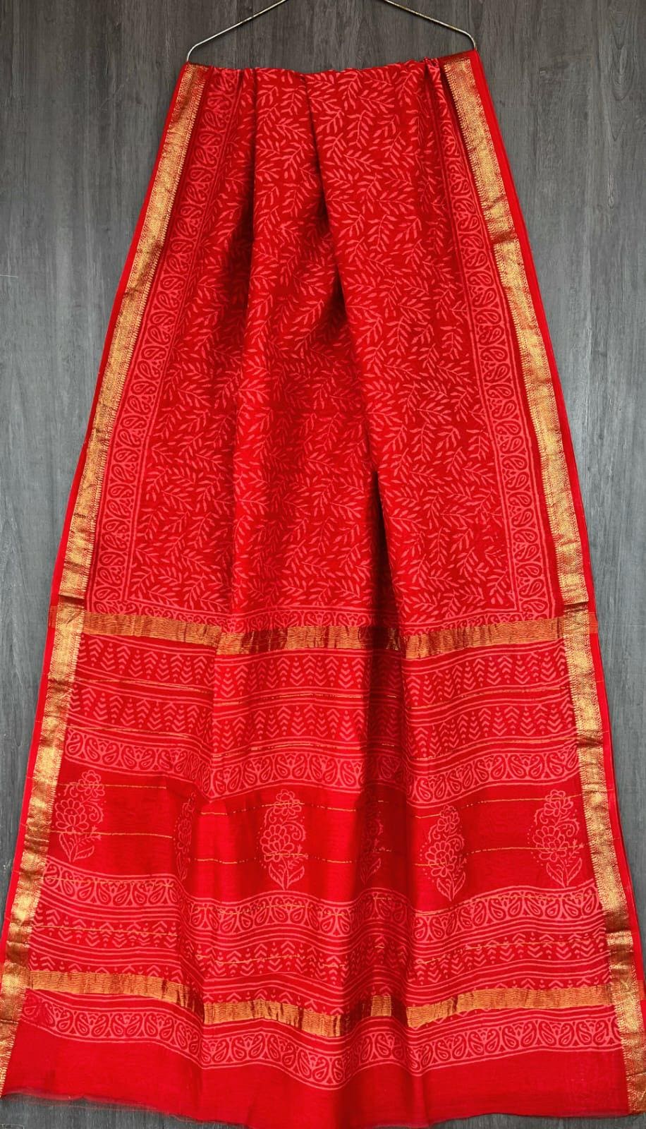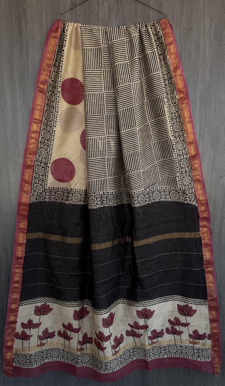 Known for its incredibly lightweight and breathable texture, this elegant drape features a radiant rose pink body delicately decorated with white block-printed floral motifs. The pallu features beautiful horizontal stripes that perfectly complement the signature Maheshwari gold zari border, adding a touch of subtle festive gleam. Whether you are attending a daytime summer gathering, a festive Puja, or looking for sophisticated, breathable ethnic workwear, this saree gracefully drapes like an absolute dream.