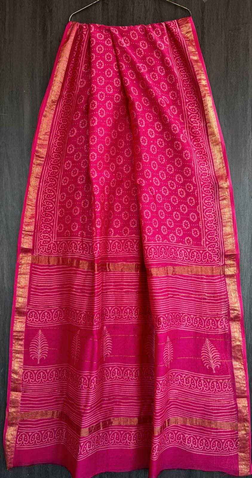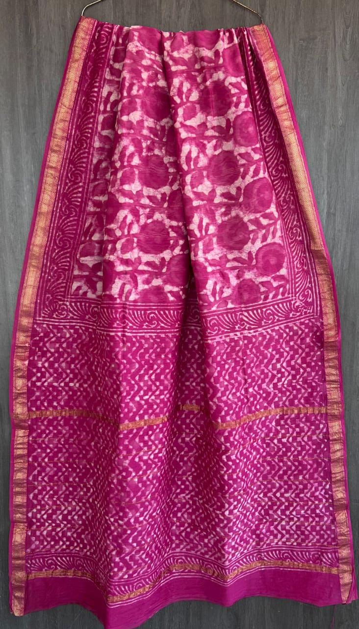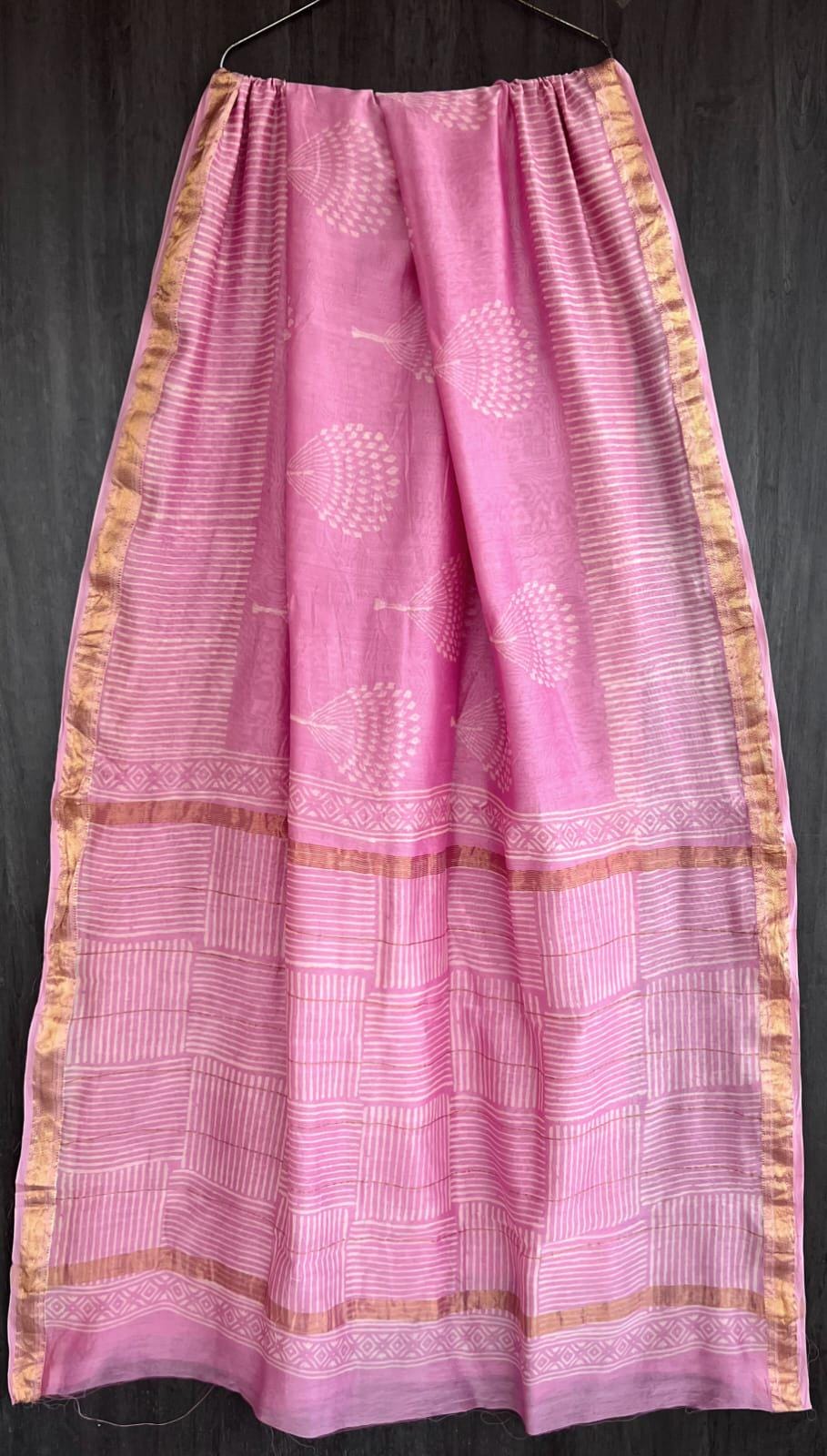 * Design: Bright rose pink body with delicate white floral block prints, a striped pallu, and a classic metallic zari border