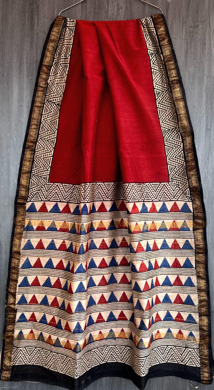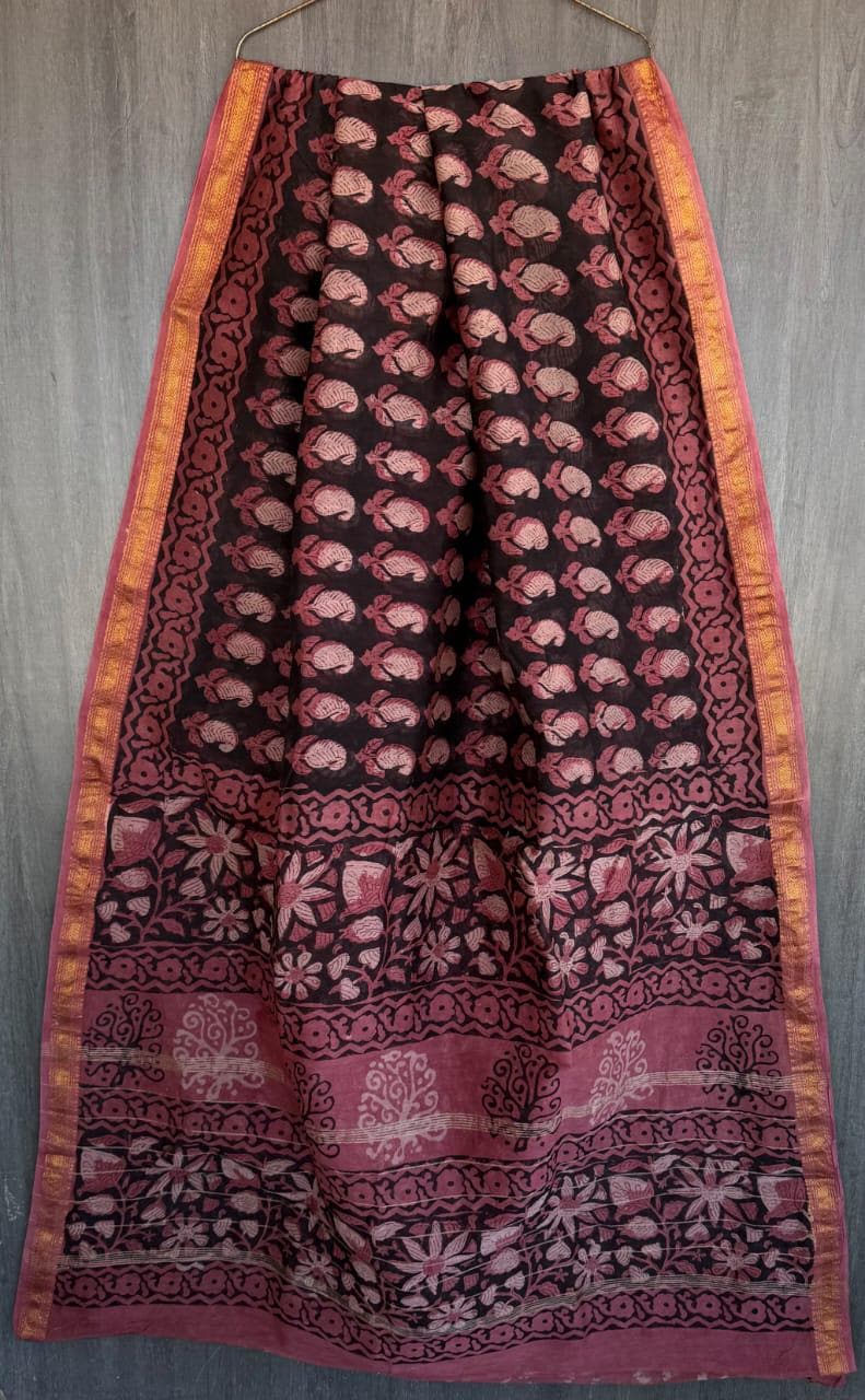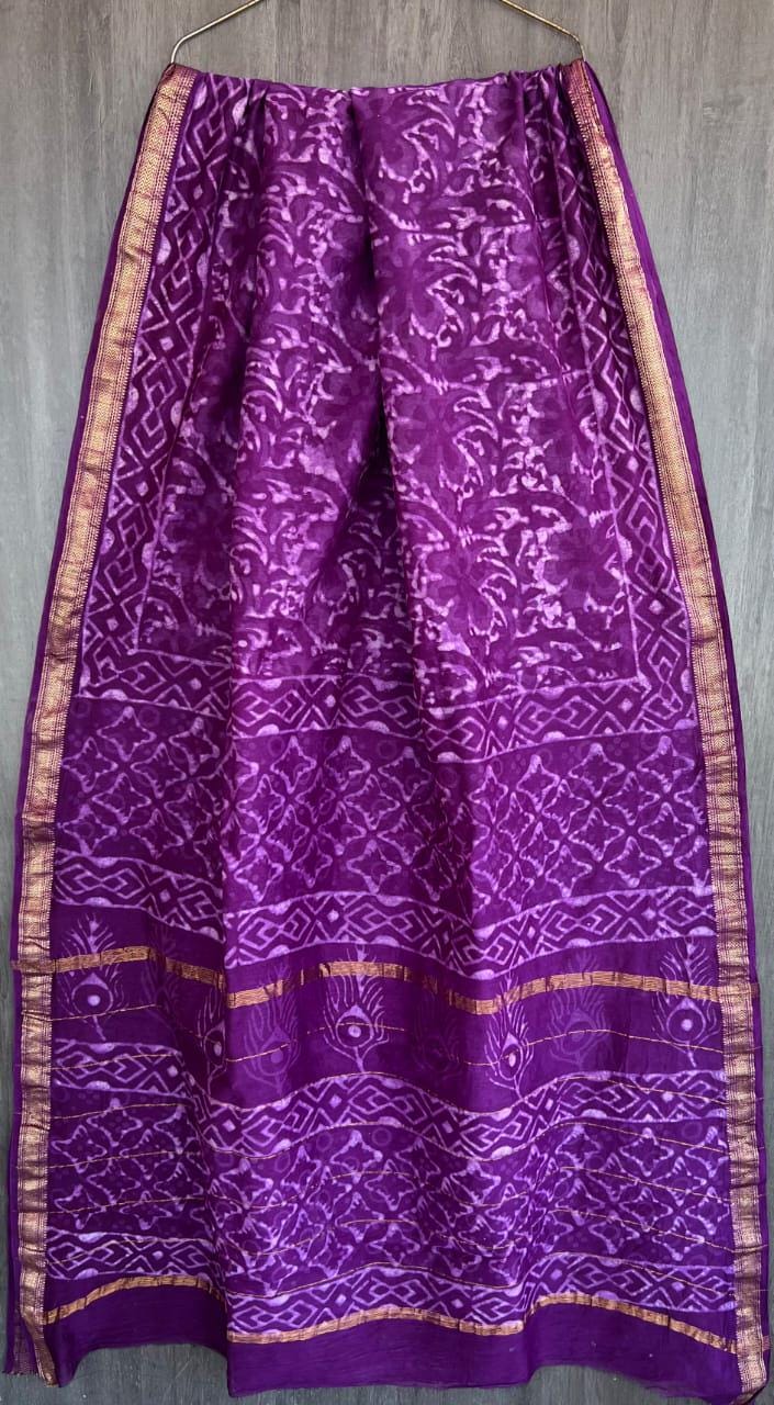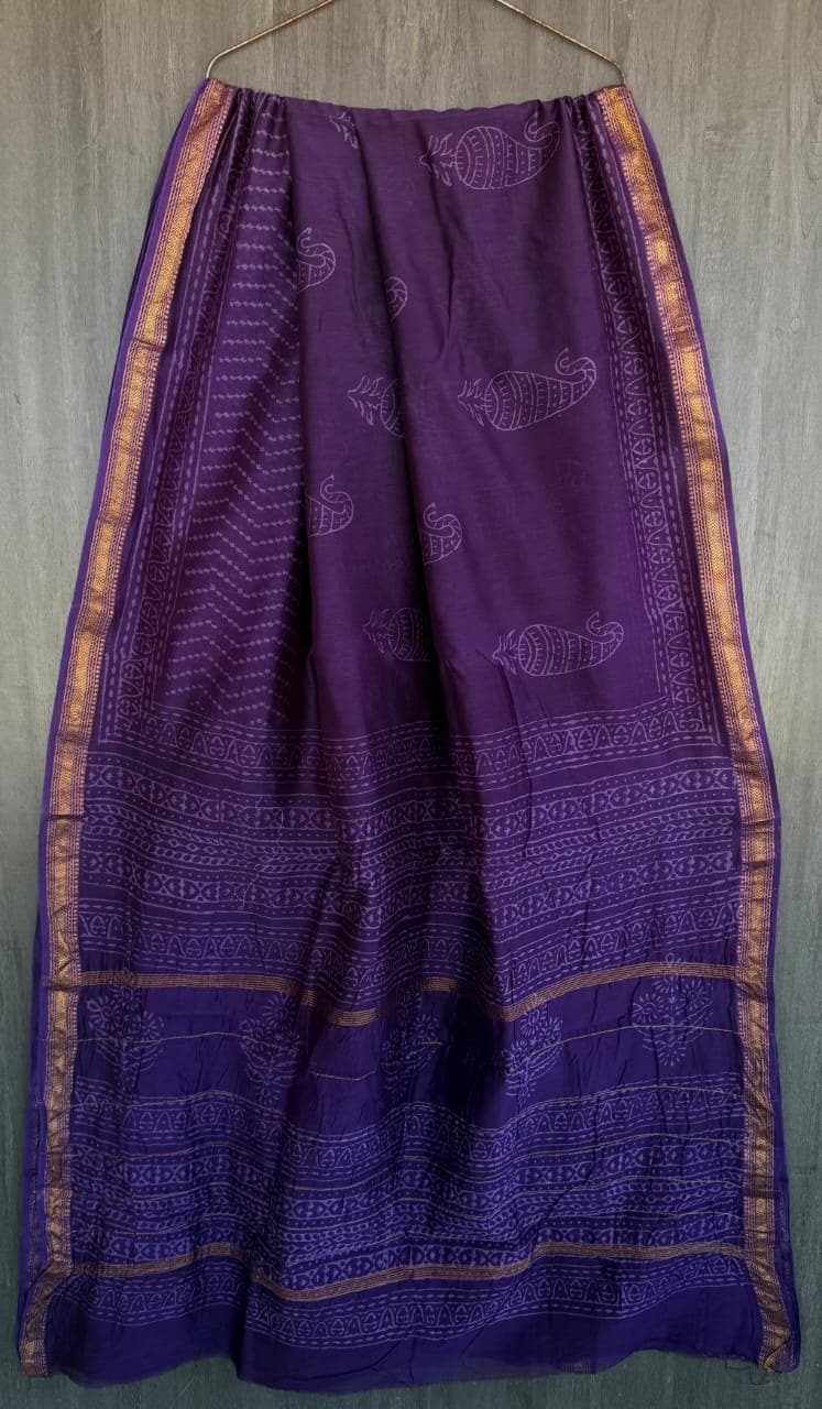 * Design: Rich purple body with Batik-style block prints and a classic metallic zari border