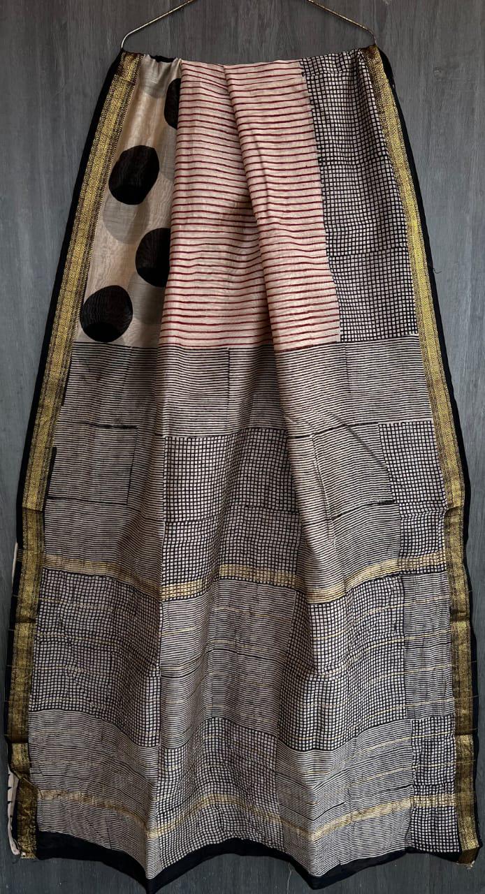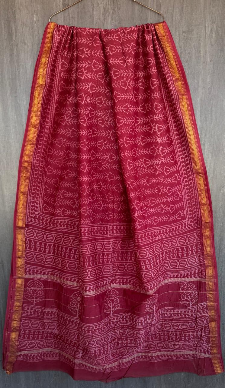 Known for its incredibly lightweight and breathable texture, this elegant drape features a rich, deep purple body decorated with stunning white block prints inspired by traditional Batik and Shibori resist-dye techniques. The signature Maheshwari gold zari border adds a touch of festive gleam, perfectly framing the intricate geometric and floral motifs of the pallu. Whether you are attending an evening gathering, a festive Puja, or looking for sophisticated, breathable ethnic workwear, this saree gracefully drapes like an absolute dream.