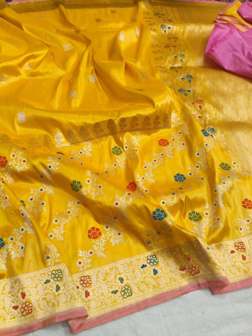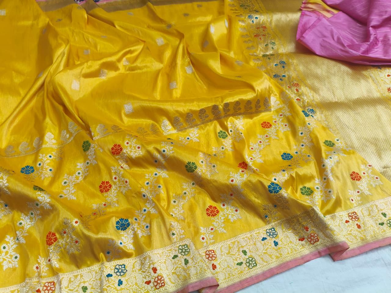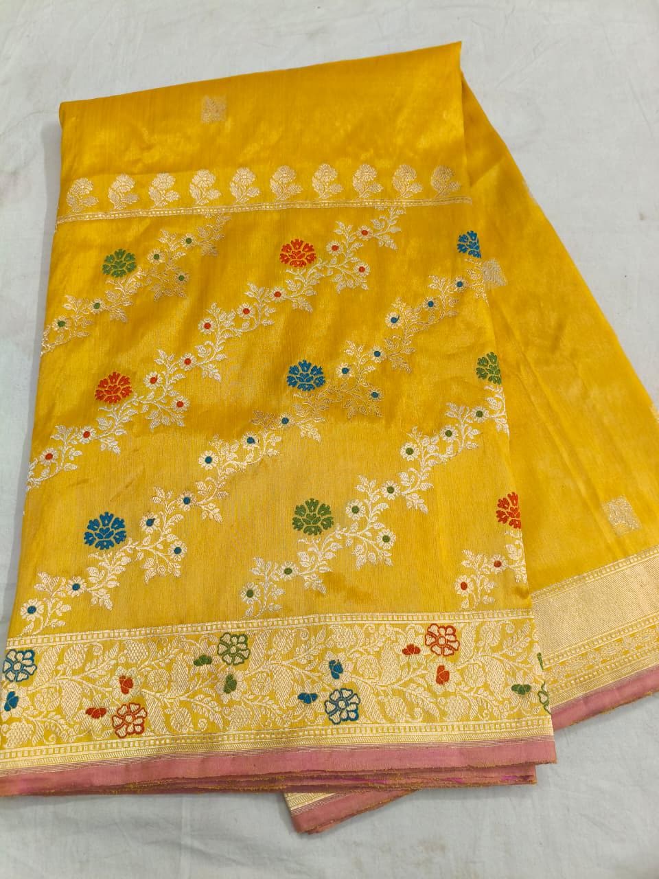 * Design: Radiant yellow base with diagonal gold zari Jangla work, highlighted by vibrant multi-colored Meenakari floral motifs