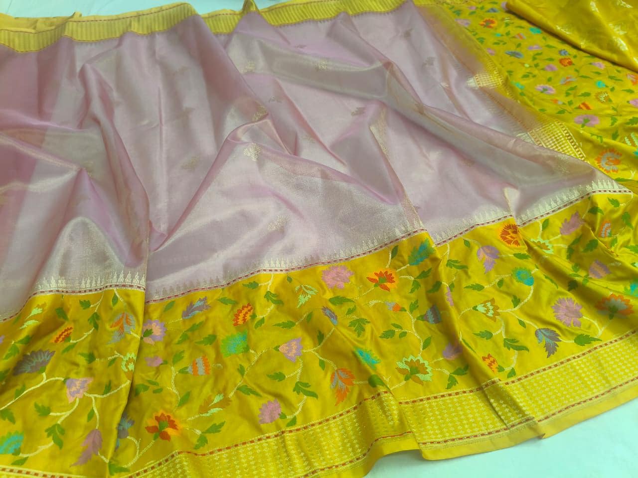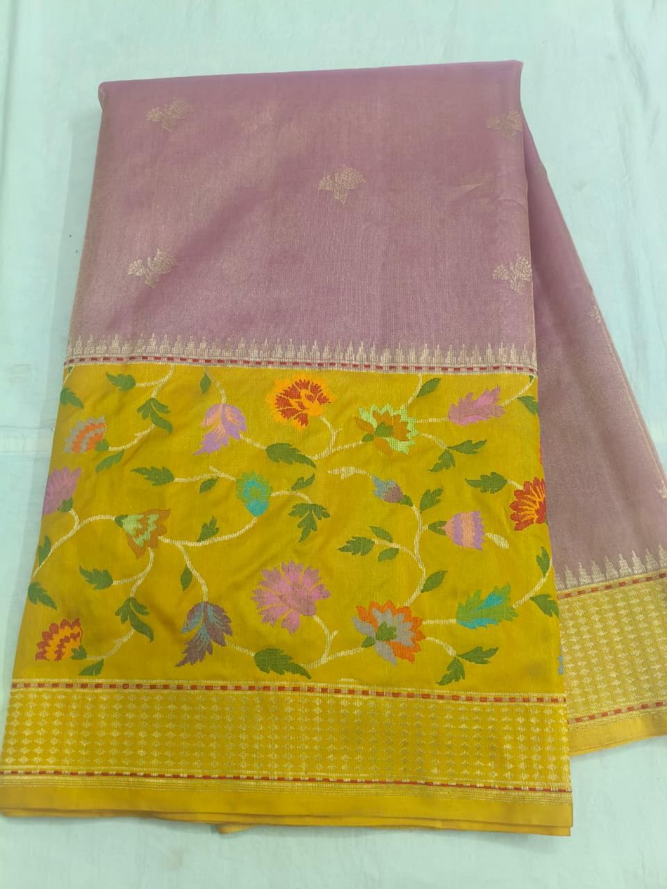* Design: Radiant yellow base with diagonal gold zari Jangla work, highlighted by vibrant multi-colored Meenakari floral motifs
