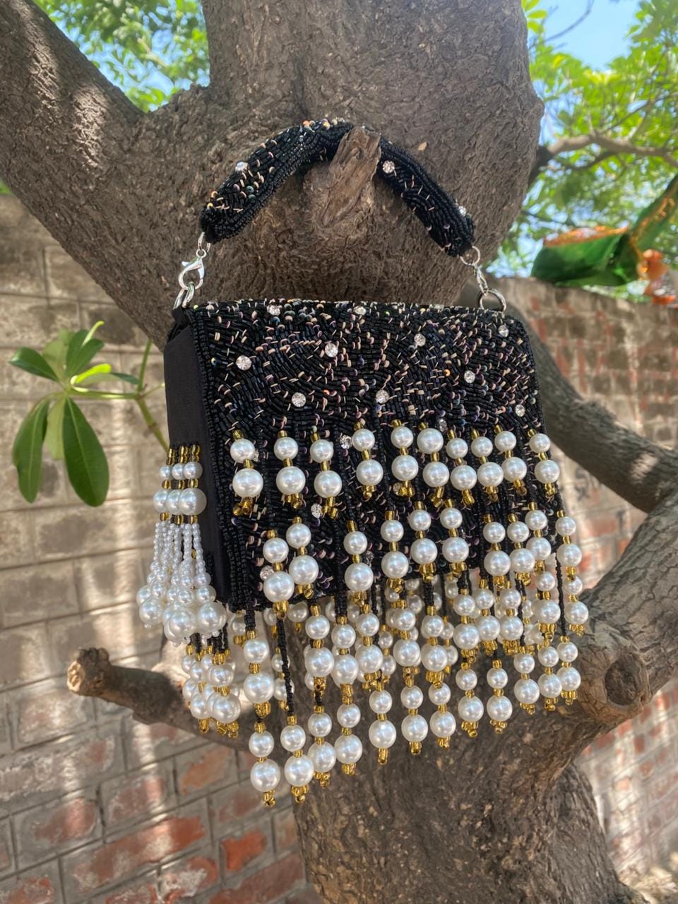 * Details: Dramatic cascading pearl fringe and a comfortable, fully beaded top handle for a luxurious, maximalist finish