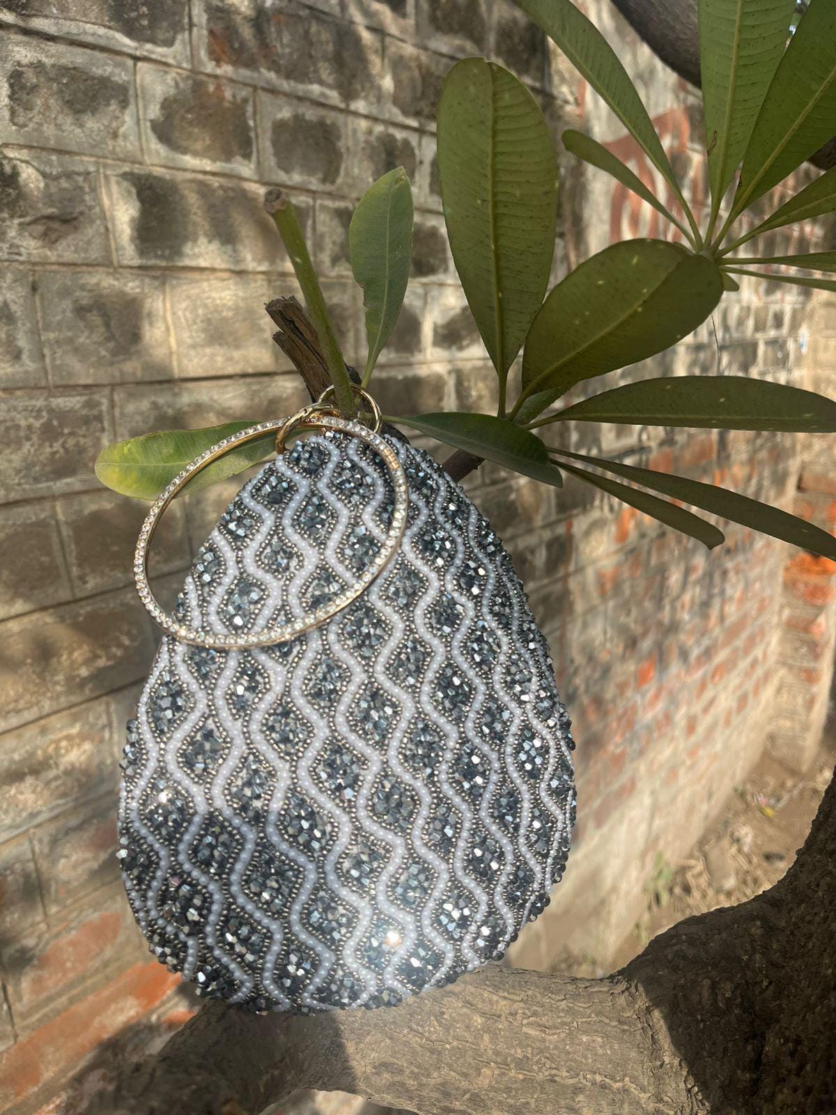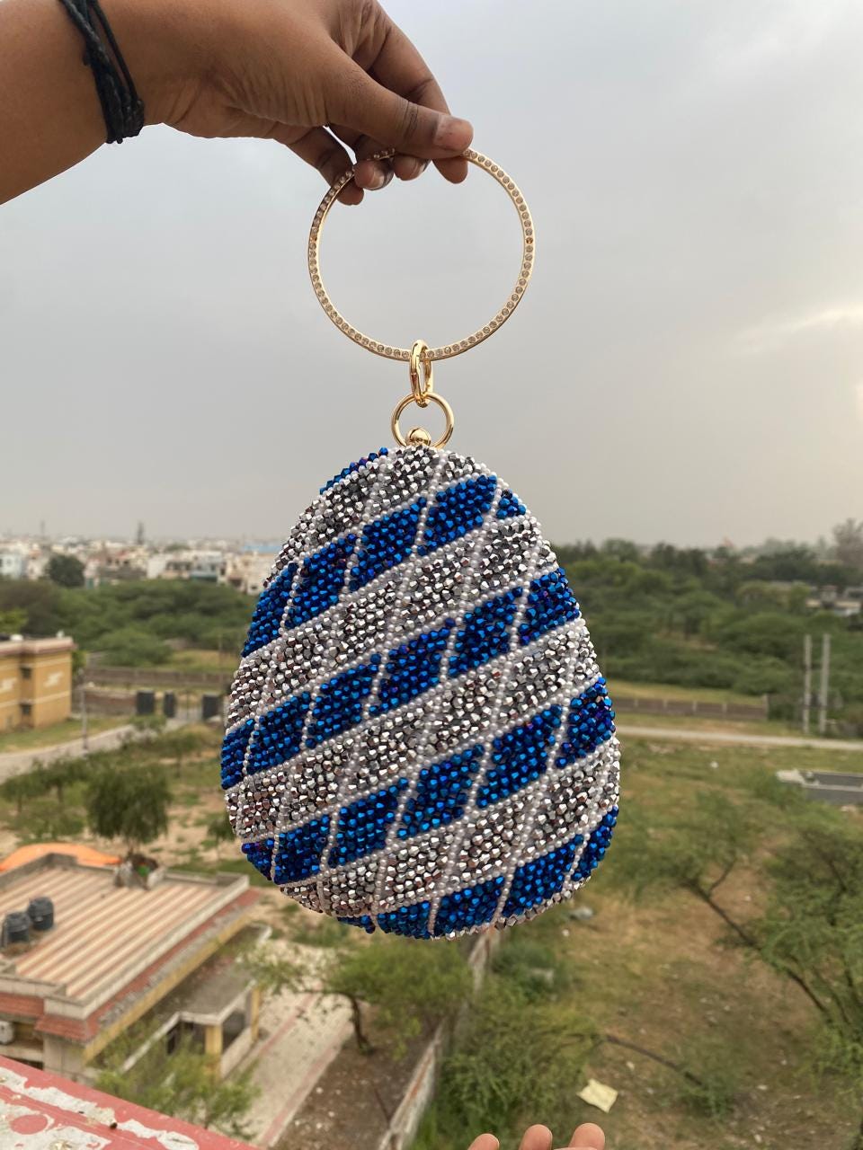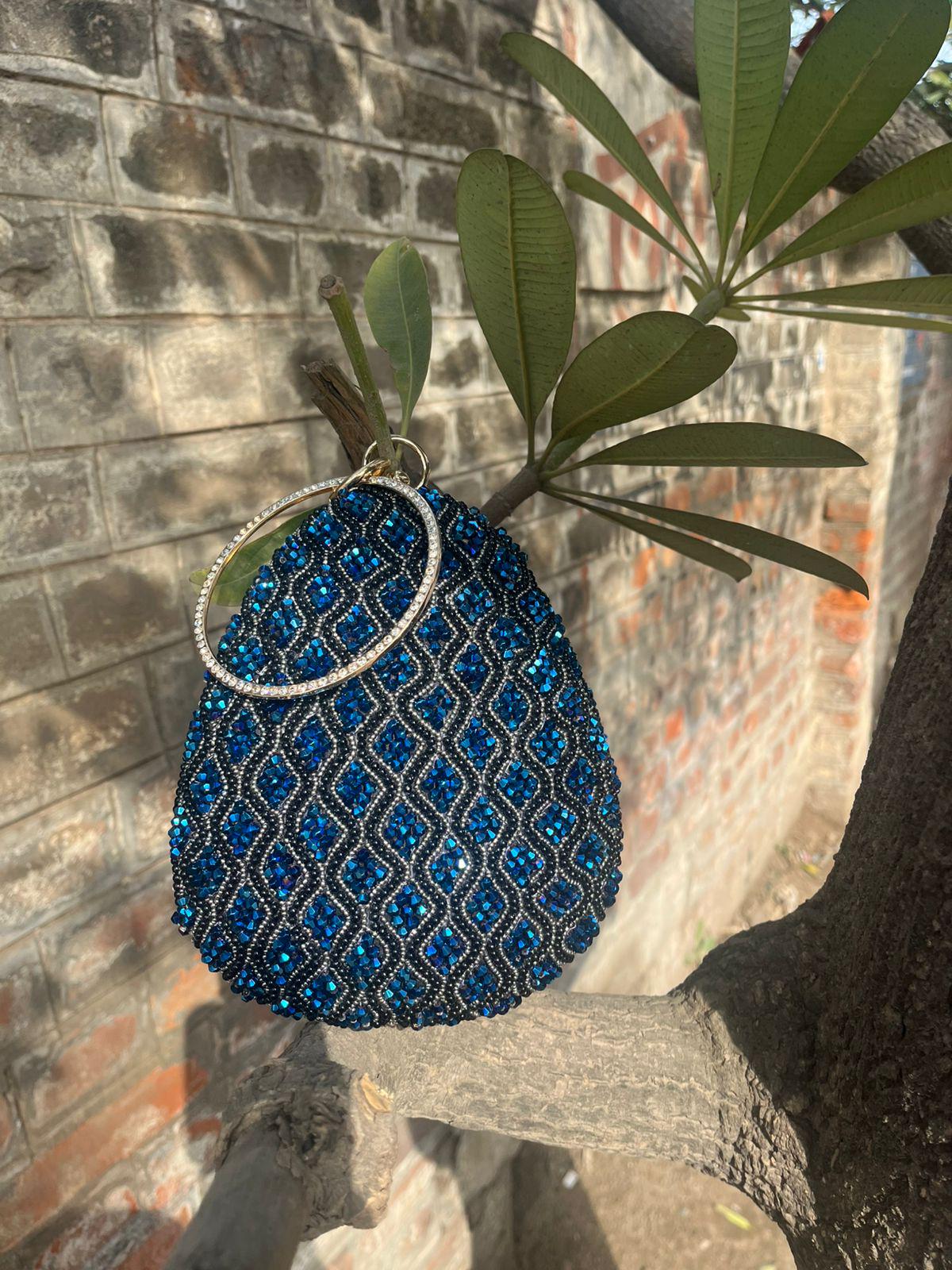 Get ready to turn heads with this breathtaking bohemian-luxe handbag. Designed for the eclectic maximalist, this unique teardrop-shaped pouch features a deep sapphire blue base that is entirely enveloped in intricate, hand-stitched beadwork. The faceted blue crystals create a mesmerizing geometric wave pattern that catches the light beautifully from every angle. Finished with a stunning, jewelry-inspired metal ring handle encrusted with sparkling clear rhinestones, this artisan bag is the ultimate accessory to elevate any boho-chic wedding guest outfit, evening gown, or vintage-inspired festival ensemble.