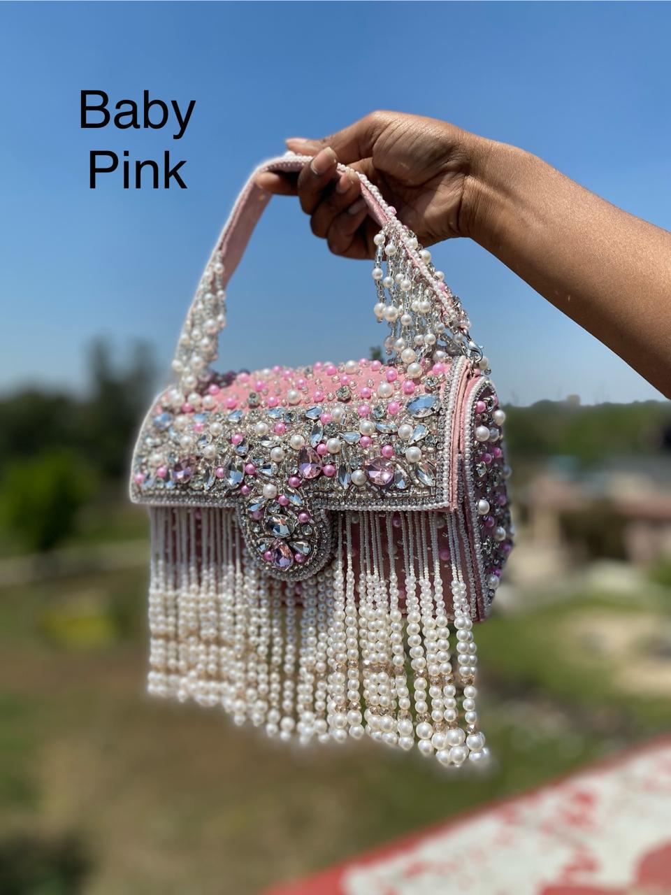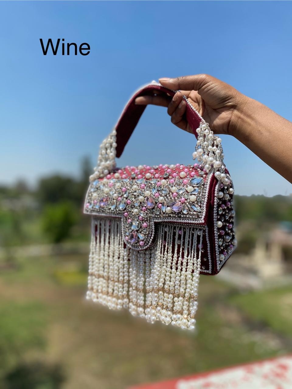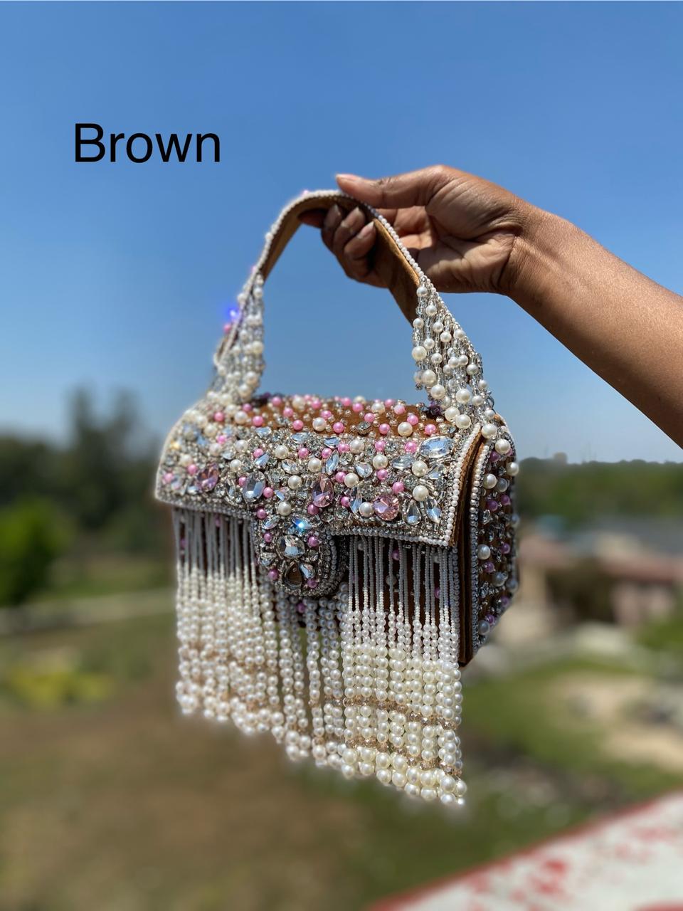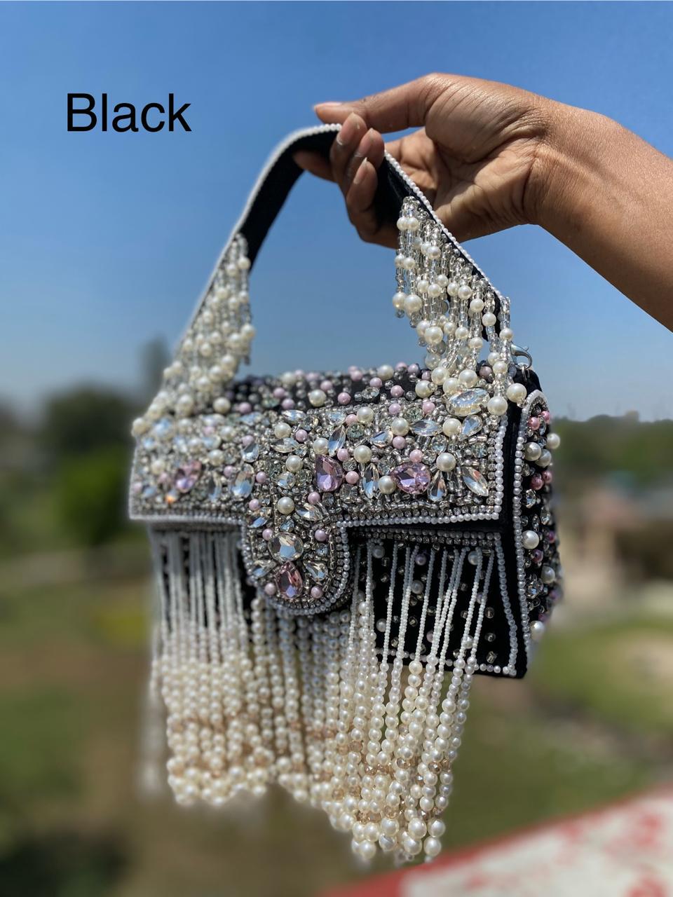 * Details: Dramatic cascading pearl bead fringe and a heavily pearl-embellished top handle for a luxurious, maximalist finish