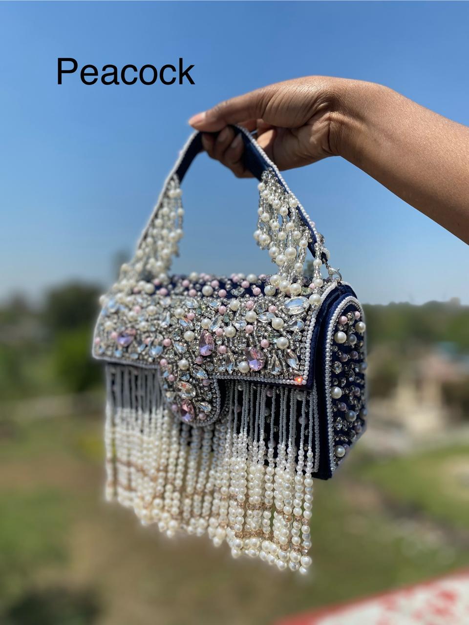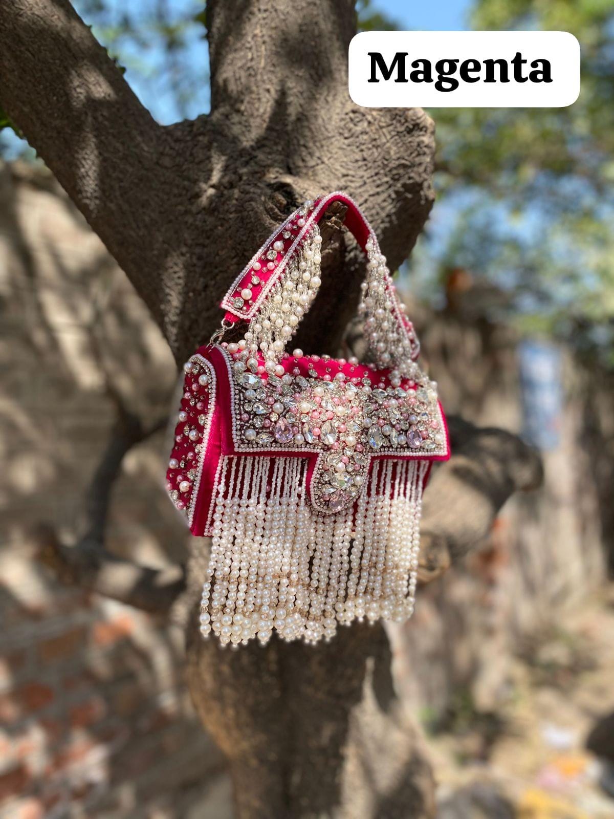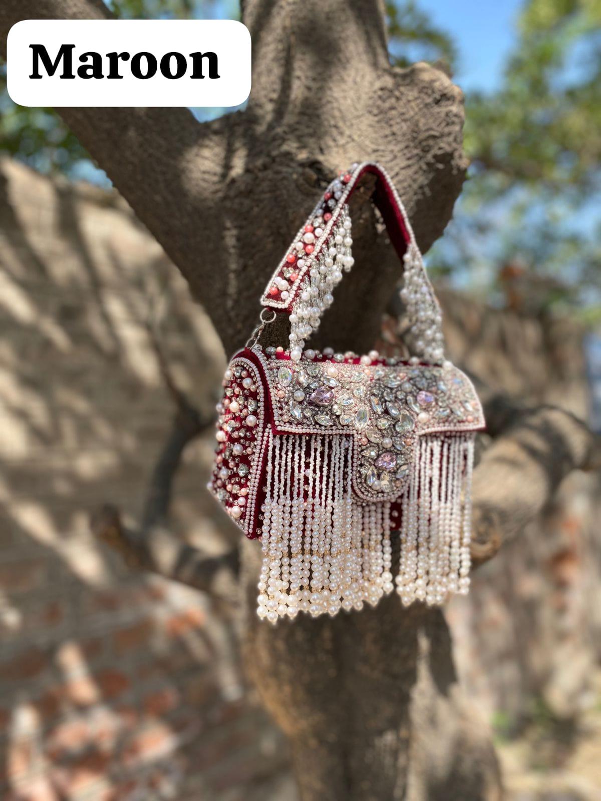* Details: Dramatic cascading pearl bead fringe and a heavily pearl-embellished top handle for a luxurious, maximalist finish