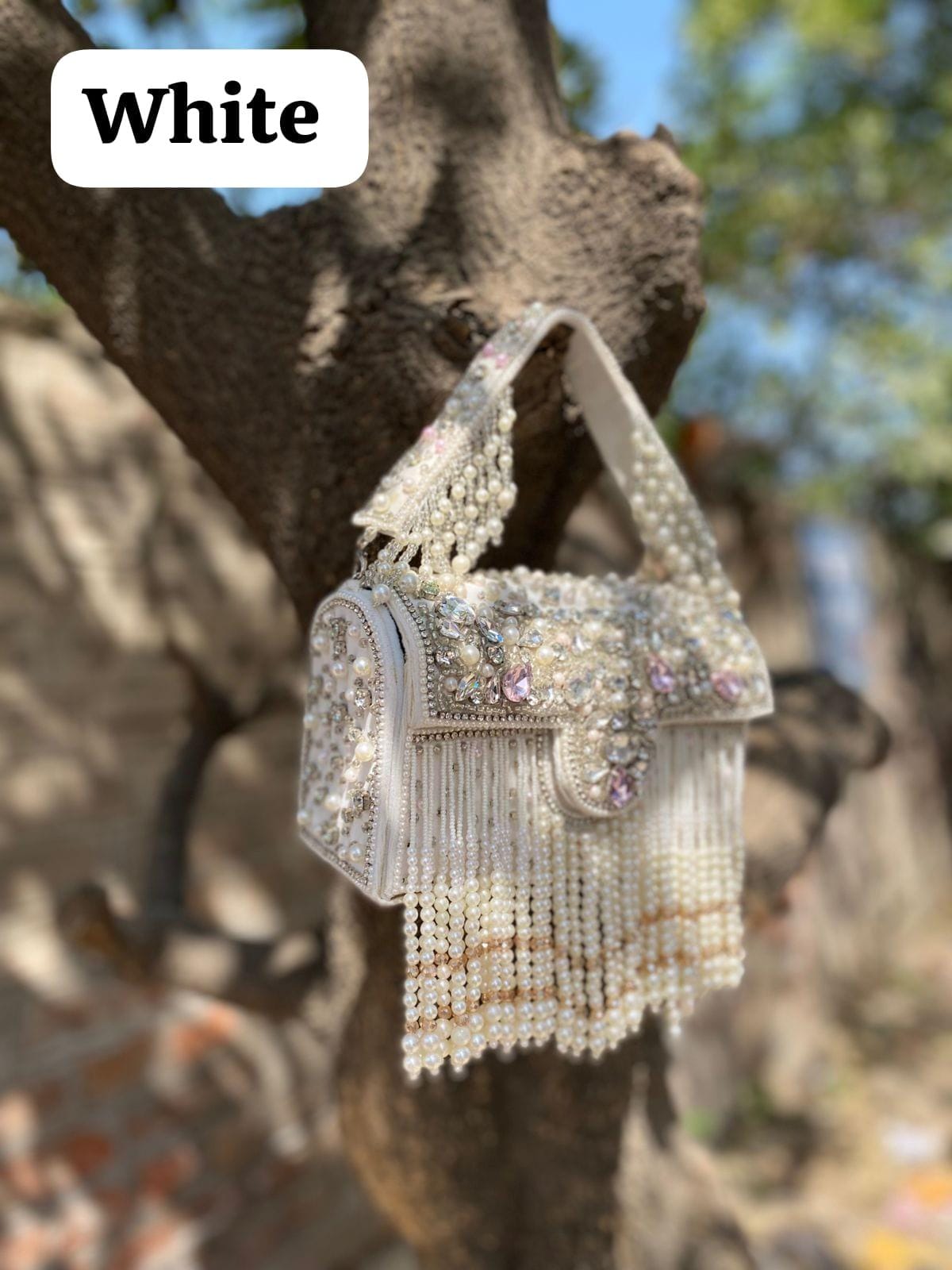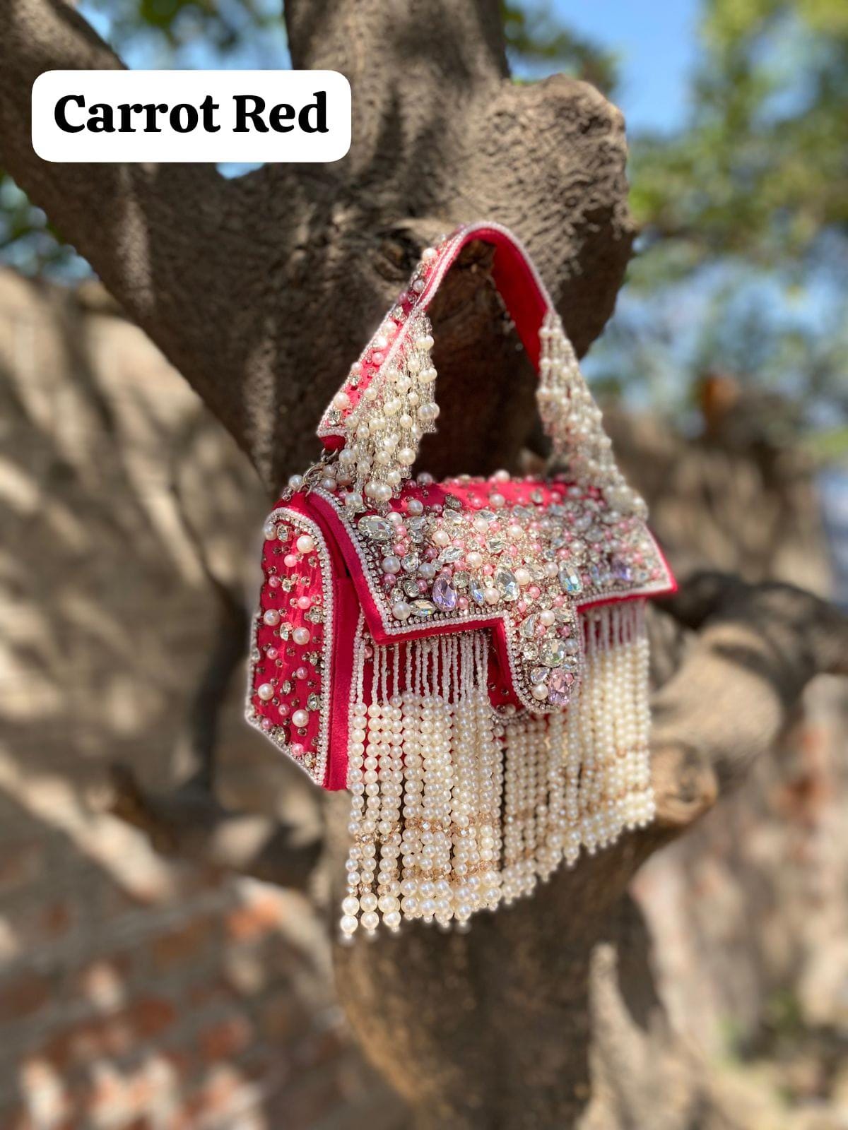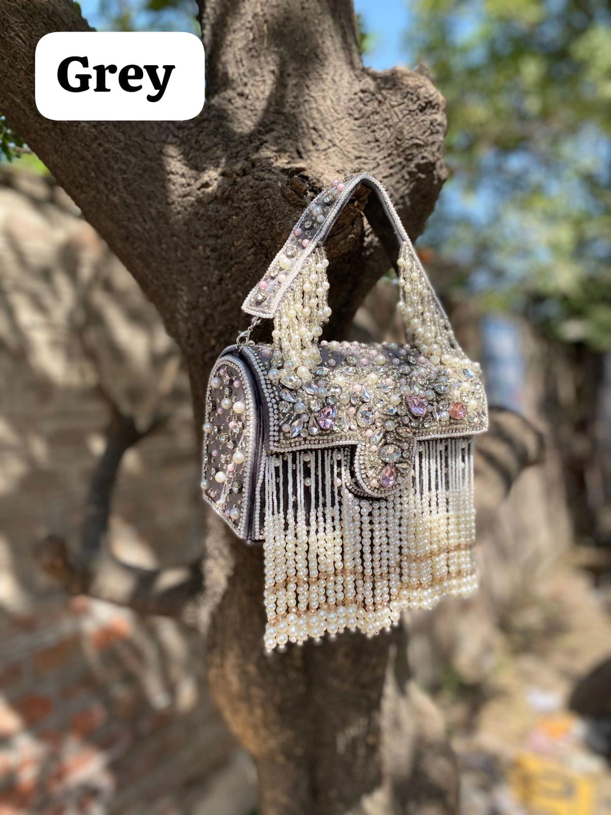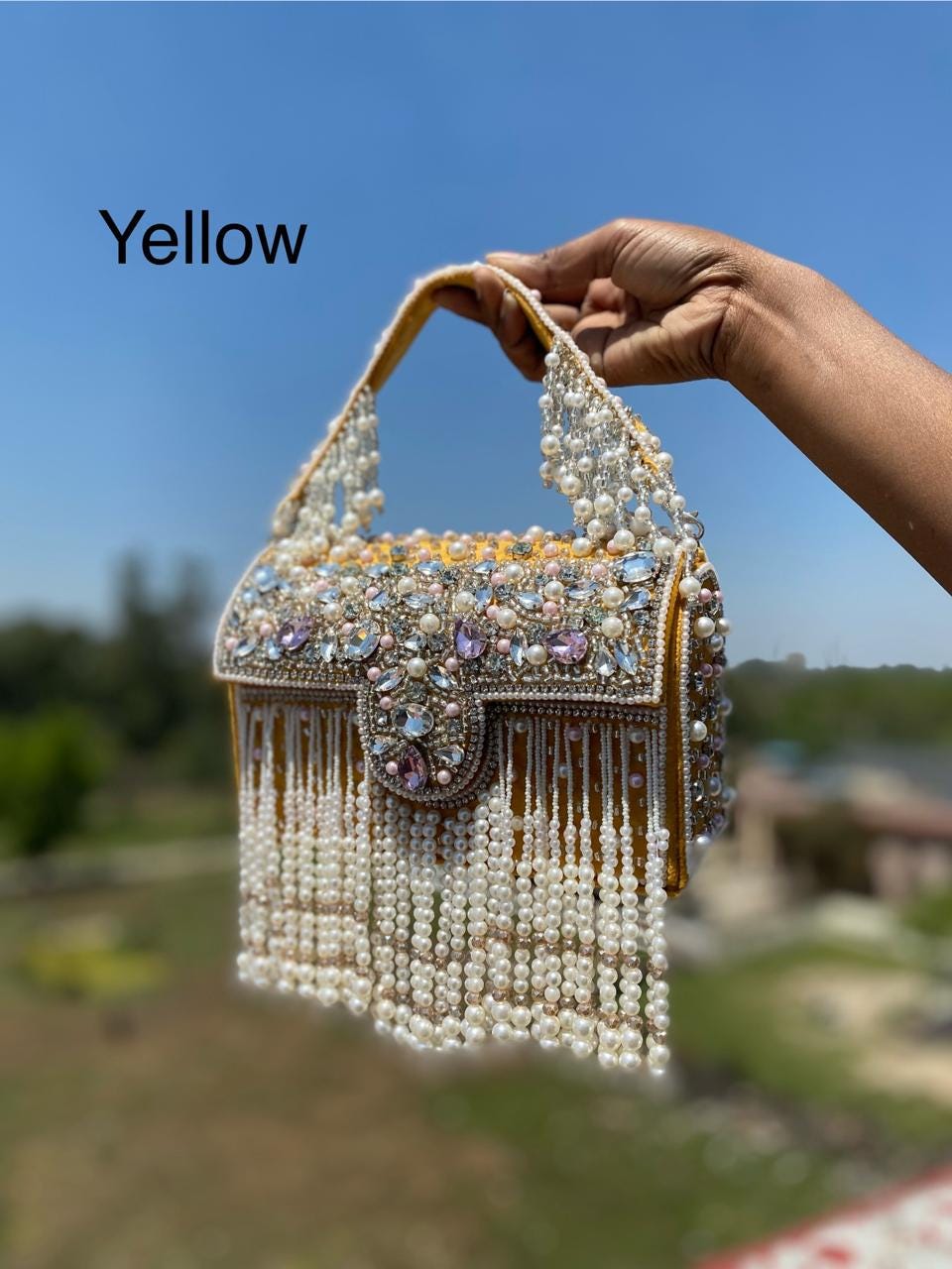 * Details: Dramatic cascading pearl bead fringe and a heavily pearl-embellished top handle for a luxurious, maximalist finish