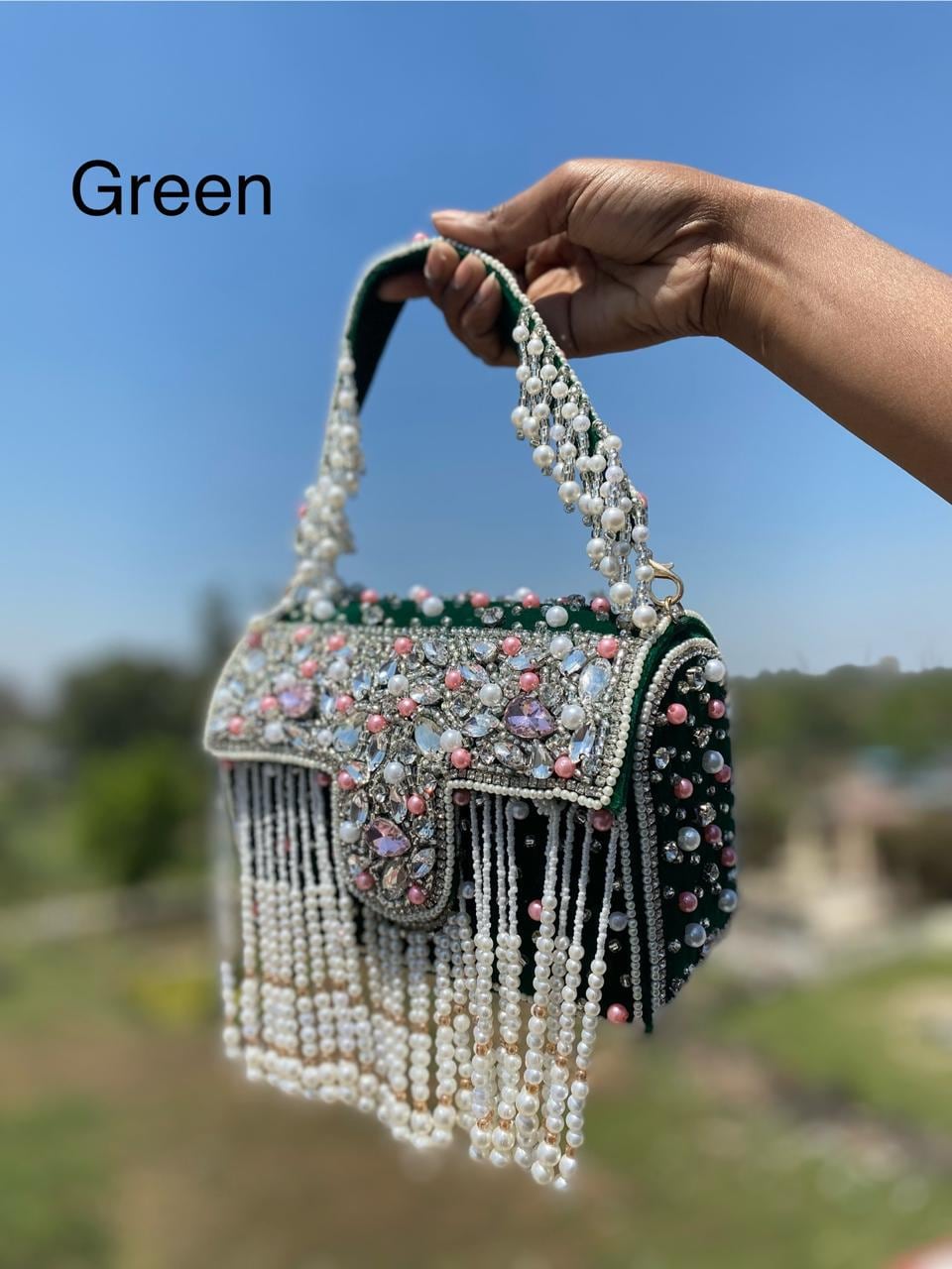 * Design: Plush green structured handbag featuring a front flap heavily adorned with mixed crystals, pearls, and pink stones