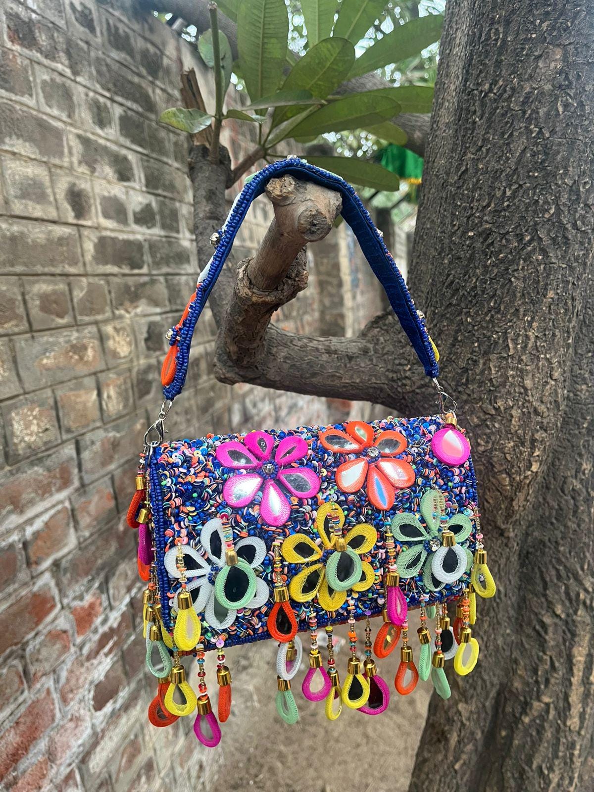 Get ready to turn heads and dance the night away with this stunningly vibrant bohemian shoulder bag. Designed for the eclectic maximalist, this purse features a deep blue base that is entirely enveloped in shimmering sequins and seed beads. The true magic lies in the oversized, retro-inspired mirror-work flowers bursting in neon shades of hot pink, bright orange, sunshine yellow, and lush green. Finished with a fun, dramatic fringe of dangling beads, colorful fabric teardrops, and tiny metallic bells, this artisan bag is the ultimate boho accessory to elevate any music festival outfit, tropical vacation look, or eclectic everyday ensemble.