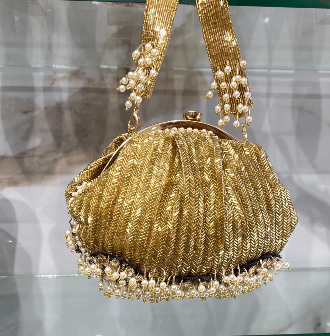 * Details: Secure metal frame clasp closure, a matching beaded handle with pearl tassels, and a dramatic pearl and champagne crystal bottom fringe
