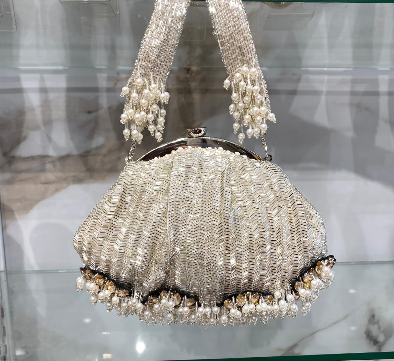 Get ready to turn heads with this breathtaking bohemian-luxe handbag. Designed for the eclectic maximalist and lovers of vintage glamour, this stunning gathered clutch features a gleaming silver base completely enveloped in hand-stitched silver bugle beads arranged in a chic chevron pattern. The true showstopper is the exquisite bottom fringe, crafted from dangling pearls and faceted champagne crystals. Finished with a classic metal frame clasp and a heavily beaded strap featuring its own pearl tassel details, this artisan bag is the ultimate accessory to elevate any boho-chic wedding dress, roaring twenties themed outfit, or glamorous evening ensemble.