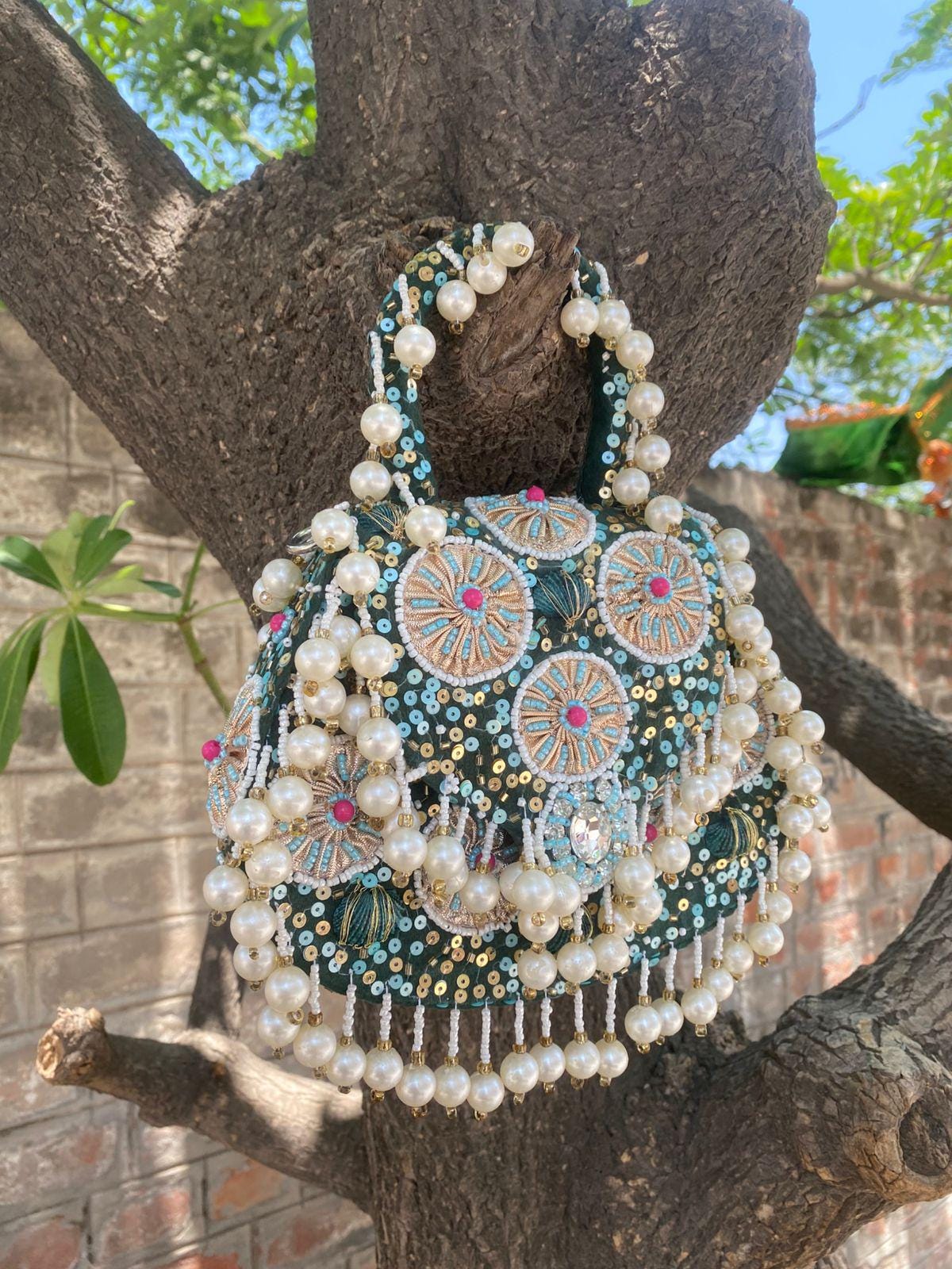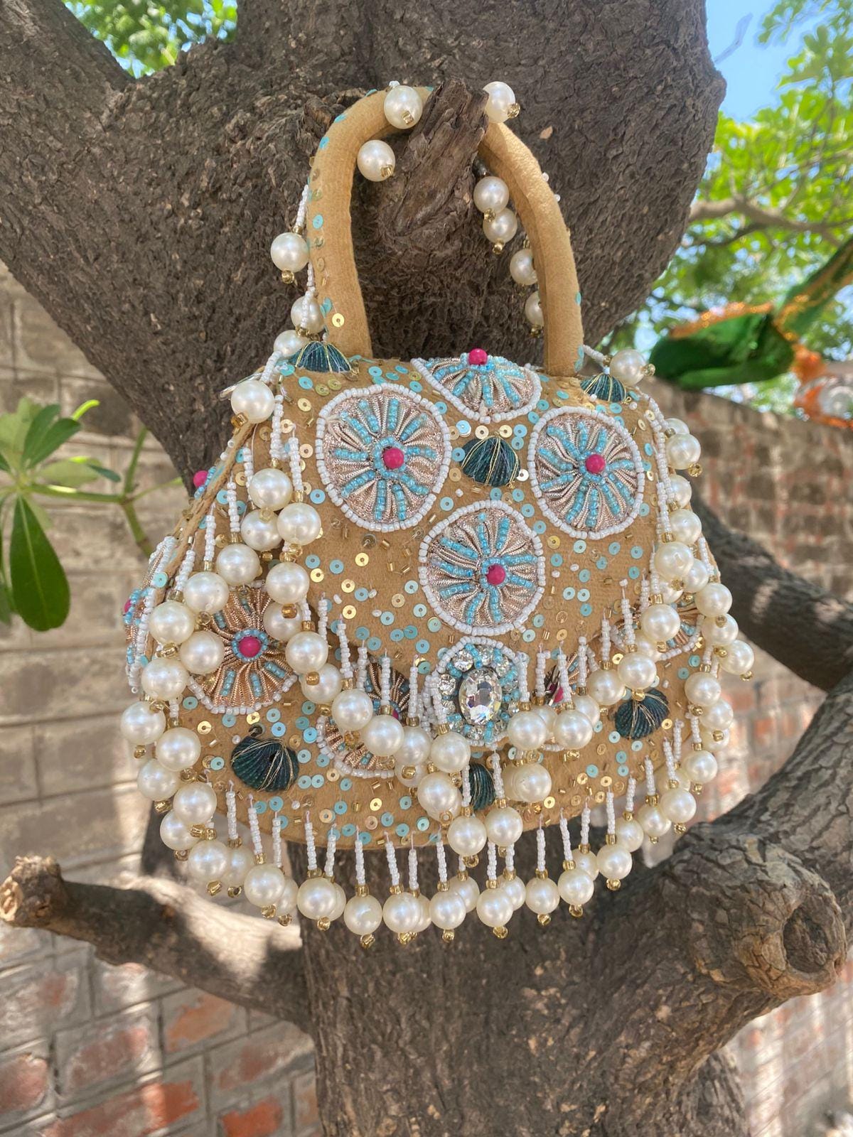 * Design: Earthy tan handbag heavily hand-beaded with vibrant turquoise circular motifs, sparkling sequins, and shell accents